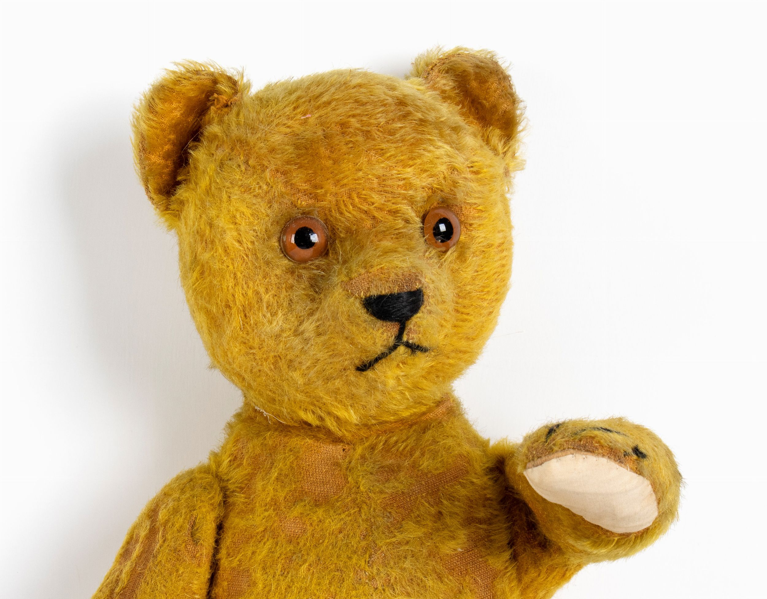 1920s Orso probabilmente BING, prodotto in Germania negli anni '20s , snodato in 5 parti, mohair biondo, occhi in vetro, 4 artigli per zampa con cuscinetti in feltro originali, naso e bocca cuciti in filo nero, verso (growler) interno. Imbottito in paglia, leggera mancanza interna alla zampa superiore sinistra, pelliccia in mohair con lievi mancanze sparse, ma in generali buone condizioni