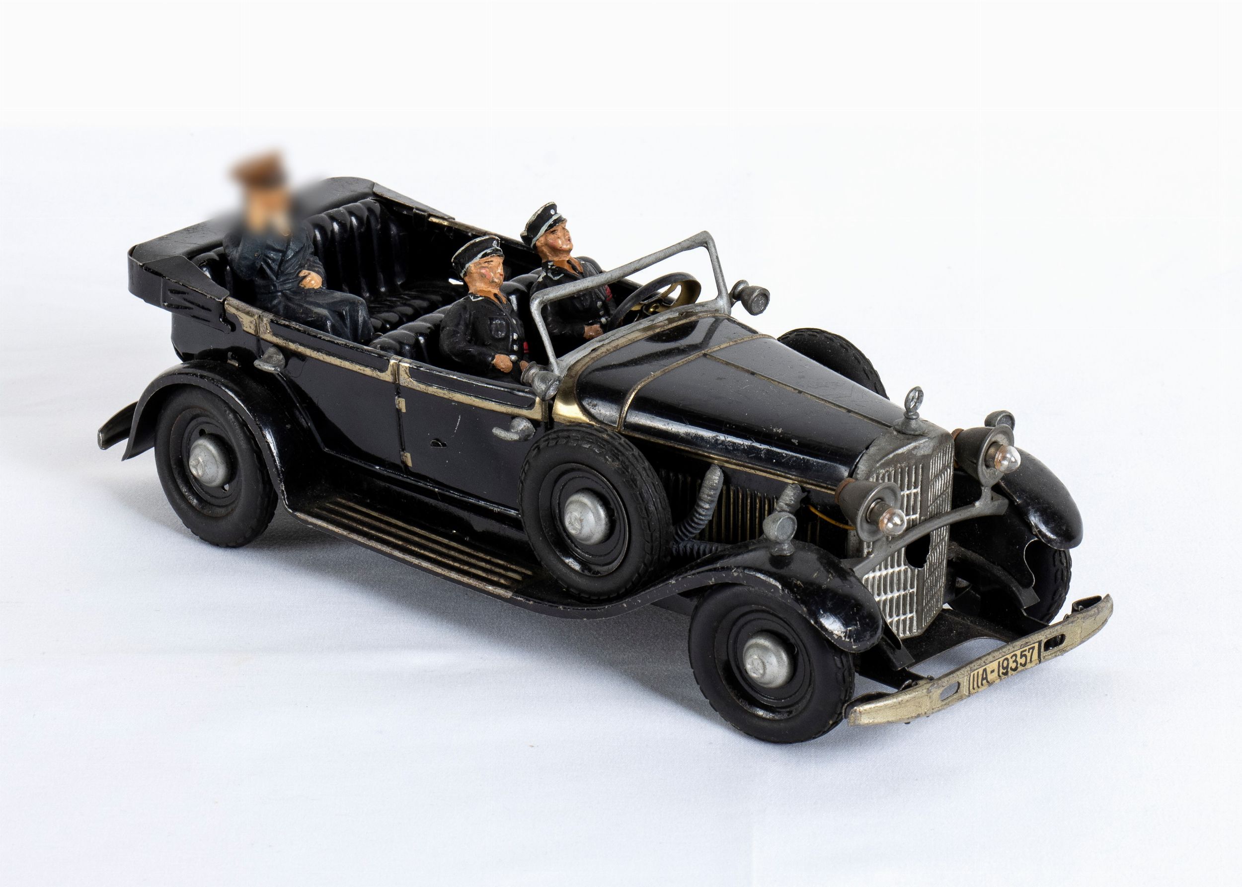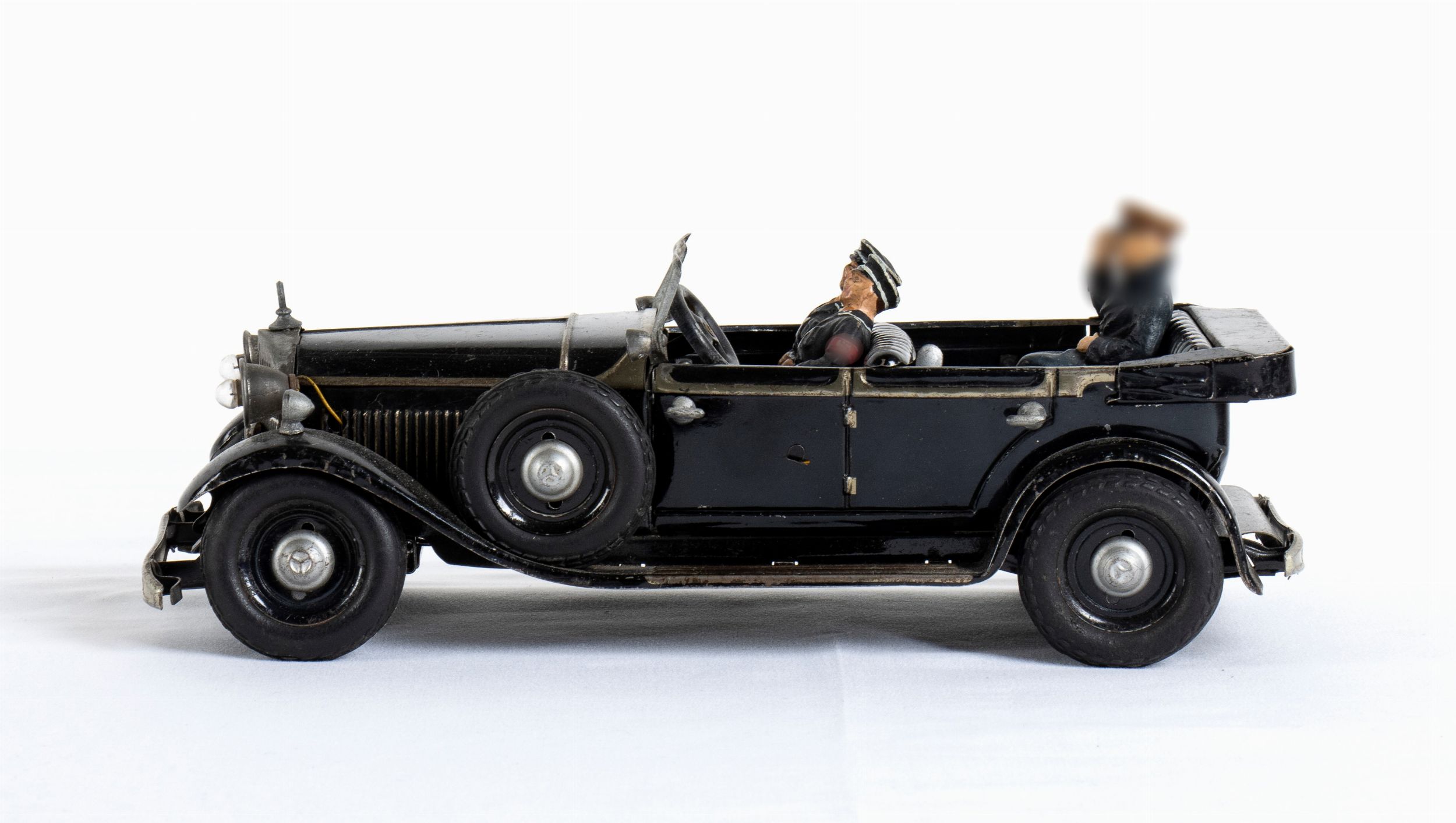 Latta, cm.23 1930s Mercedes Benz 770 di Adolf Hitler prodotta da Tipp & Co (Norimberga, Germania) nel 1937, latta litografata. Giocattolo di propaganda che riproduce la vera decappottabile di lusso utilizzata come veicolo statale da Hitler negli anni '30, con la stessa targa 11A-19357. Meccanismo di carica a molla funzionante, versione con fari elettrici (mediante batteria non fornita), personaggi riprodotti in composizione di due ufficiali nazisti ed Adolf Hitler. Due ruote di scorta laterali, giocattolo in condizioni molto buone, normali segni di gioco e del tempo