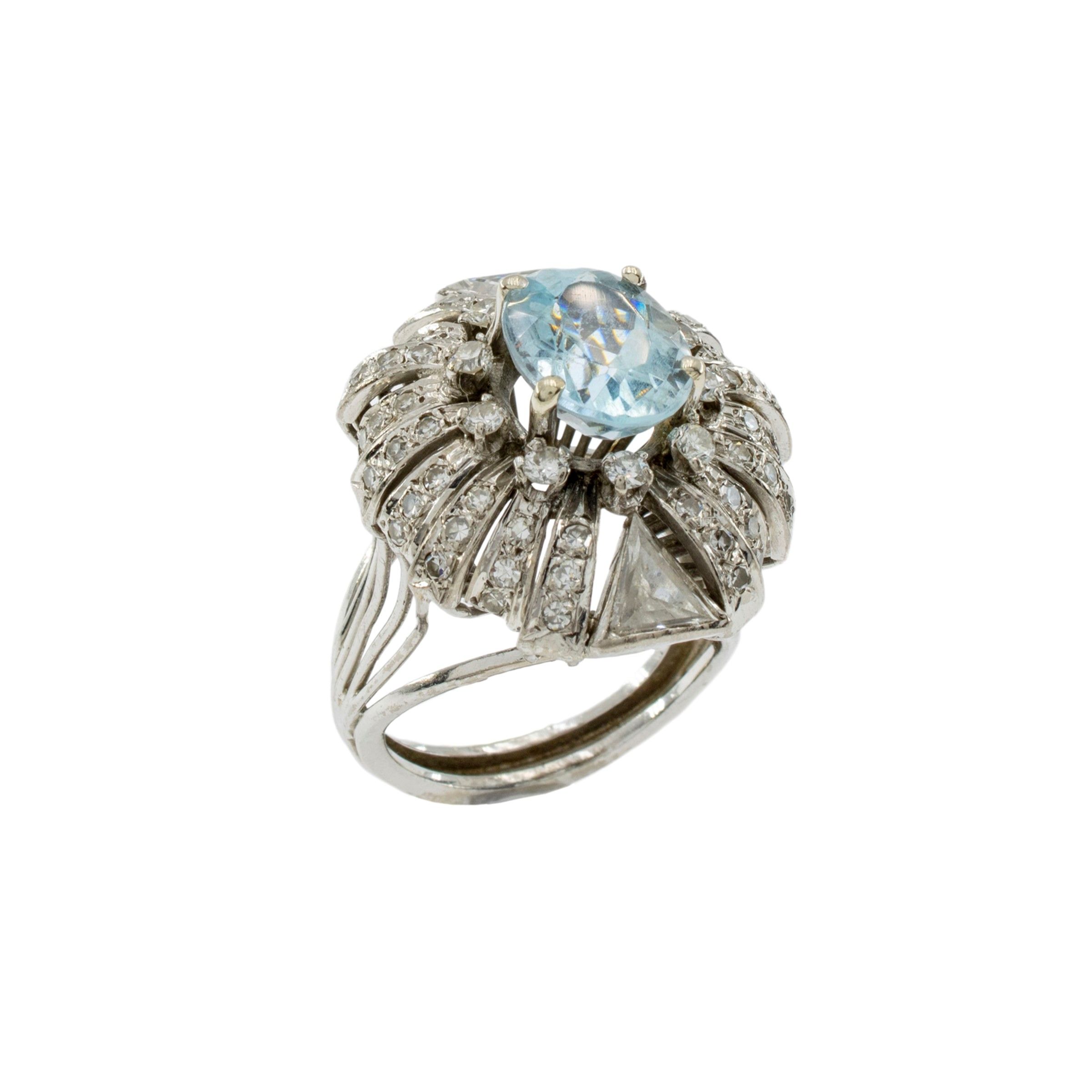 anni 40/50 acquamarina taglio ovale misto contornata da diamanti taglio brillante ct 0,70 circa e due diamanti taglio a triangolo ct 0,90 circa, misura 15