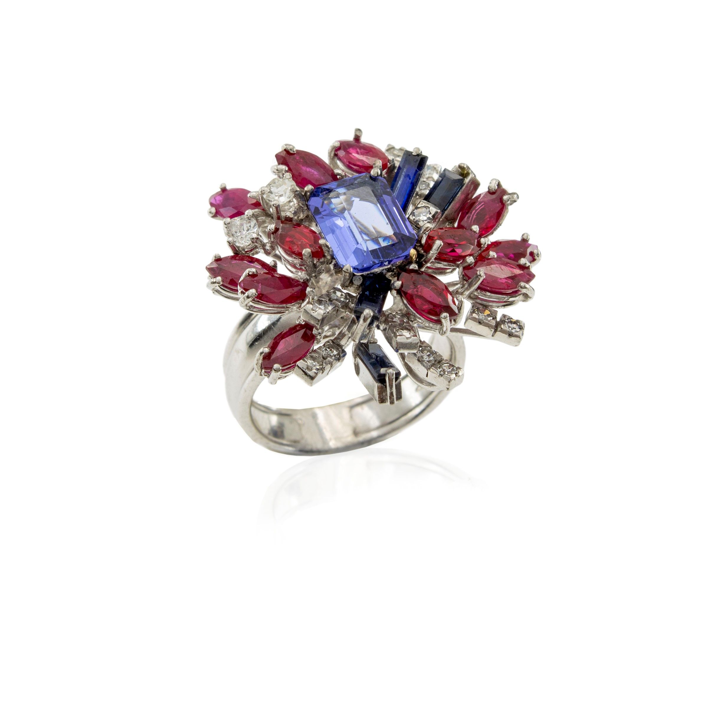 taglio ottagonale a gradini ct 2,40 circa, contornata da rubini taglio marquise, zaffiri taglio baguette e diamanti taglio brillante ct 0,25 circa, misura 17