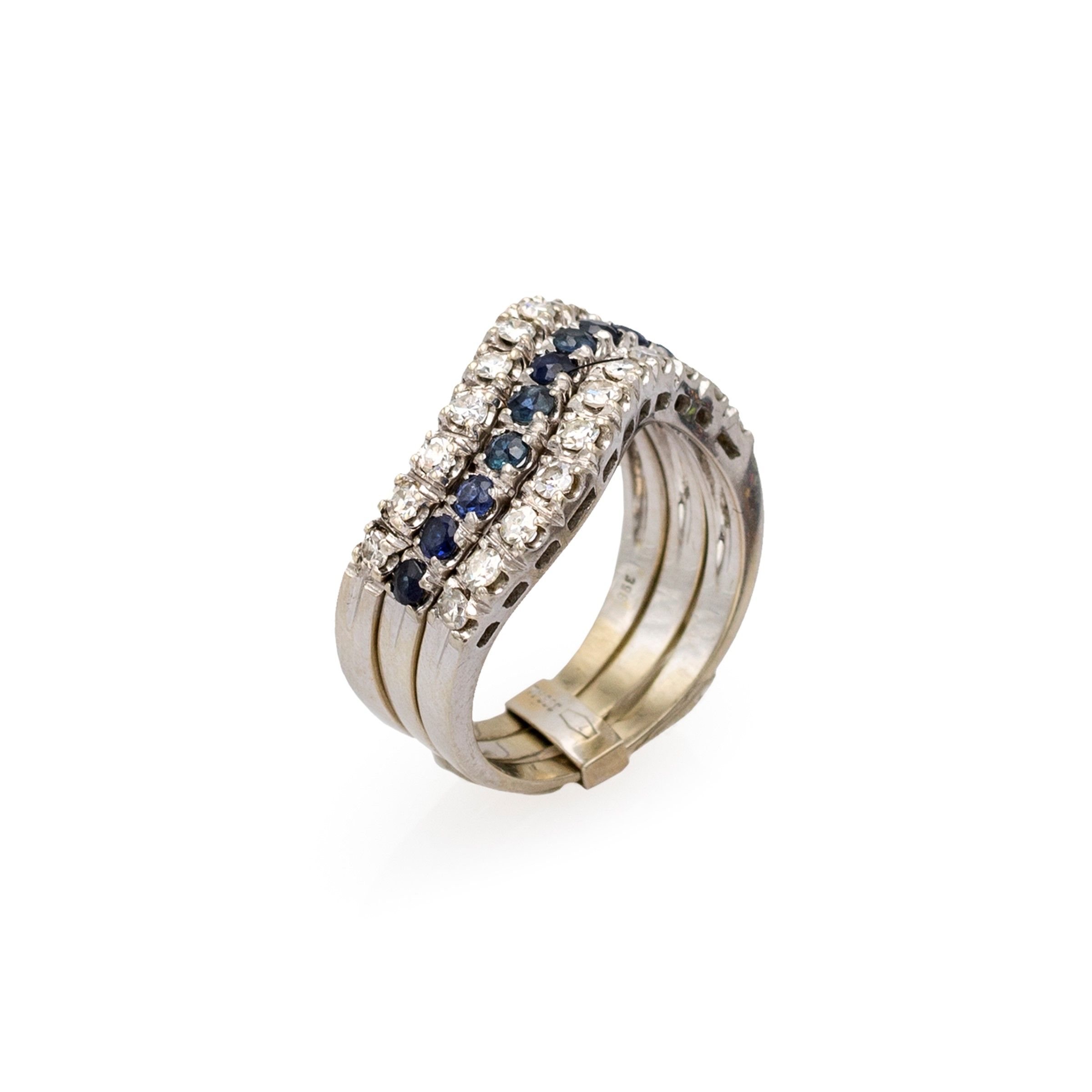 Anello tre riviere in oro bianco 18kt diamanti e zaffiri