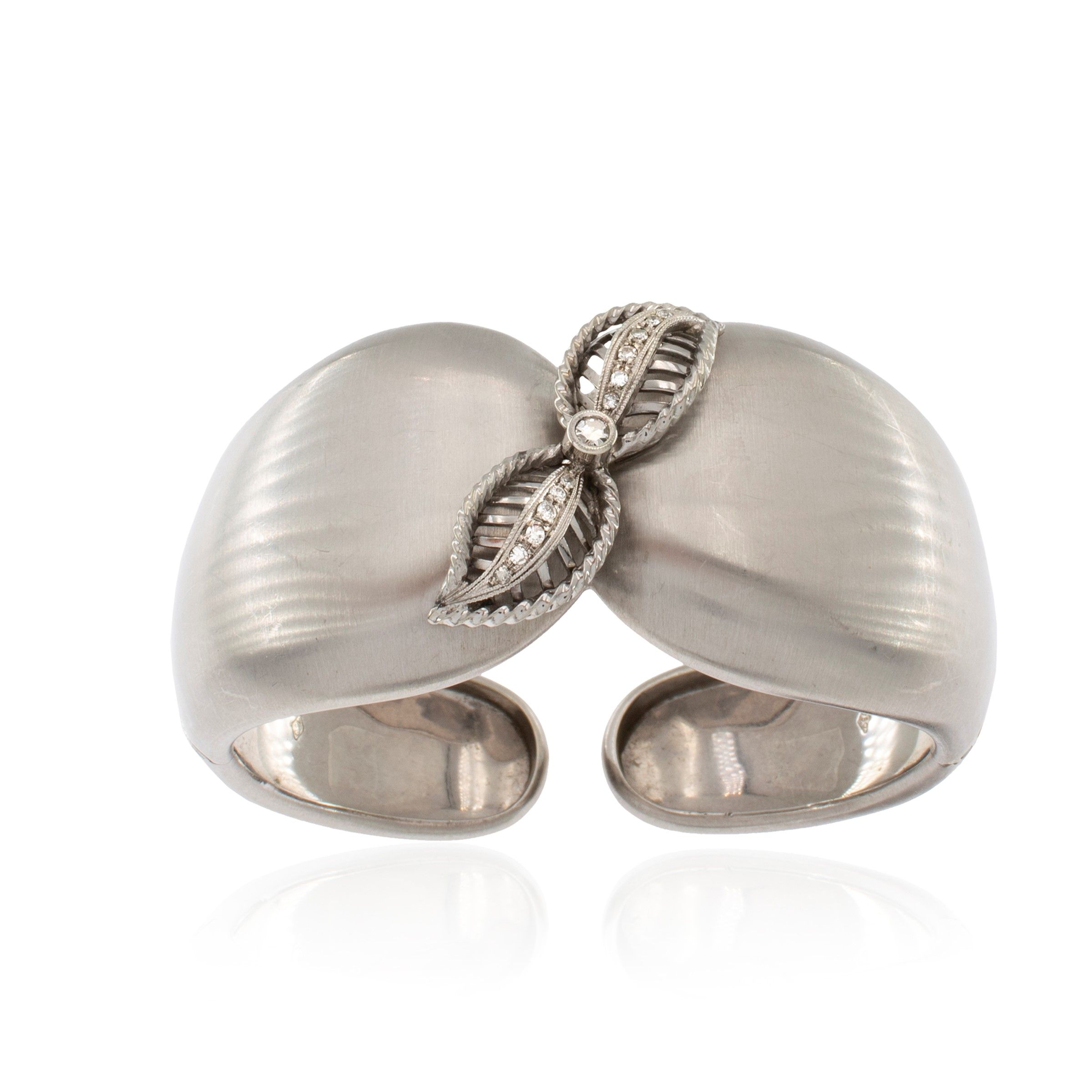 anni 60/70 centrato da foglie in oro bianco e diamanti taglio brillante, chiusura a molla, diametro 5,5 cm.