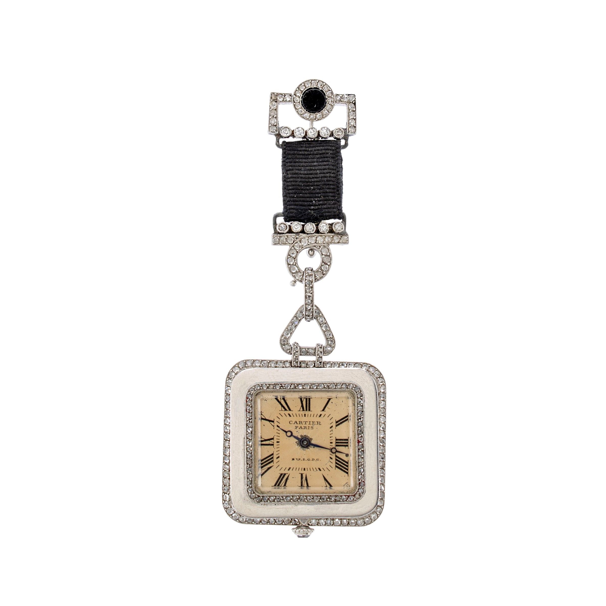 anno 1925 in platino e rose di diamante sospeso ad una châtelaine in platino onice nero e rose di diamante, cassa carré 27x27, ref. 5306-4185- 7344, quadrante guilloché con numeri romani, segni di usura, movimento meccanico a carica manuale