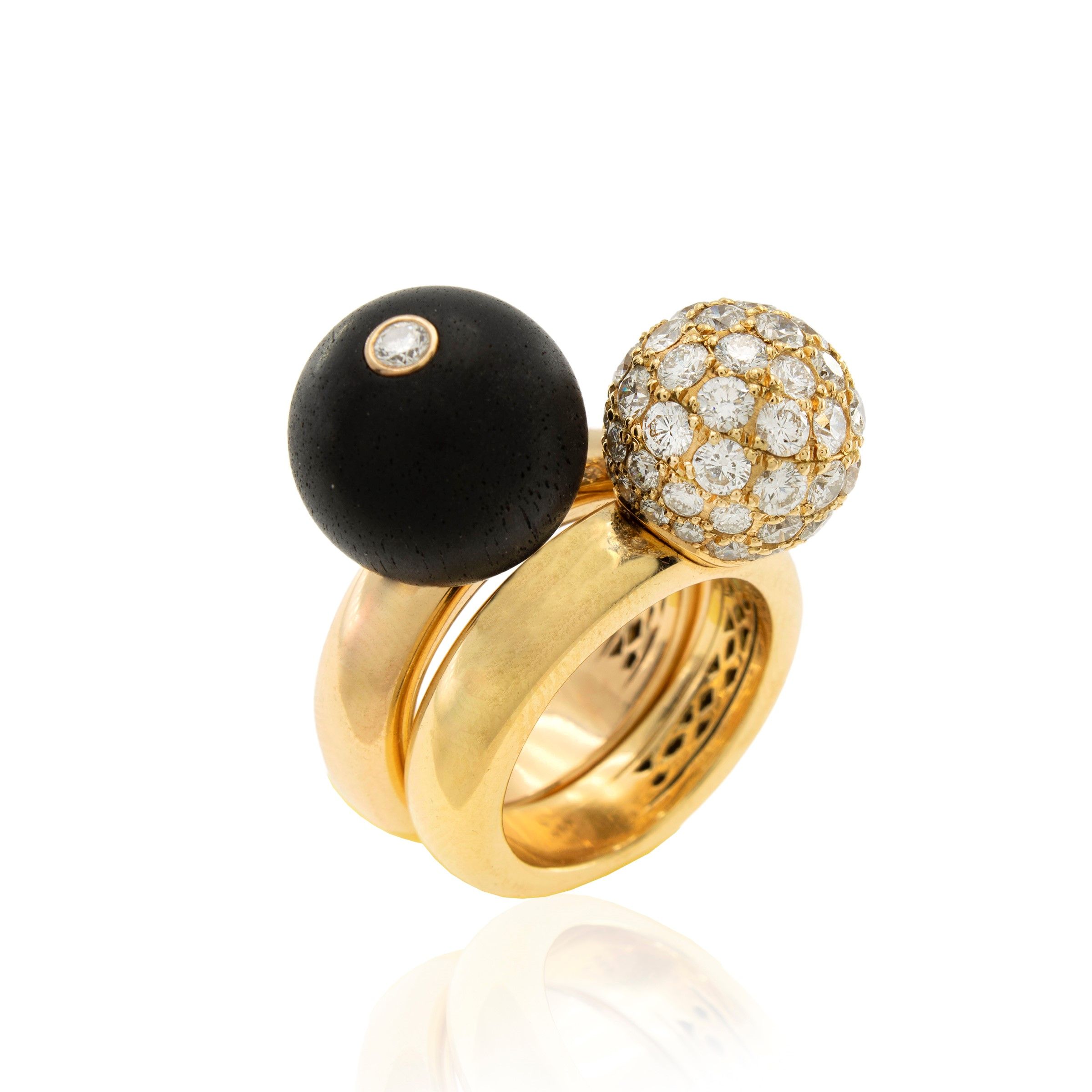 rispettivamente una sfera in oro giallo e diamanti taglio brillante ct 2,90 circa, l'altra sfera in ebano centrata da un diamante taglio brillante, misura 12
