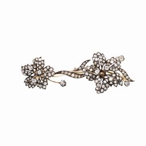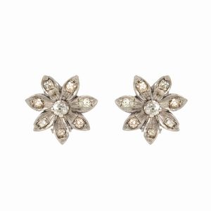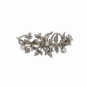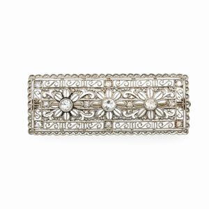 peso 10 gr. anni 30/40 rispettivamente un fiocco con rose di diamante e un rombo con rose, rubini e perlina, [..]