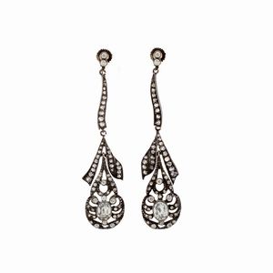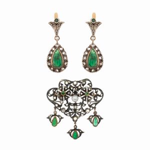 peso 31 gr. fine 800 rose diamante, smeraldi tondi e a goccia composta da spilla con pendenti dimensione 6,3x6,2 [..]