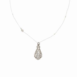 peso 4 gr. primi 900 taglio brillante ct 0,90 circa, completo di catenina in platino e perline, lunghezza 50 [..]