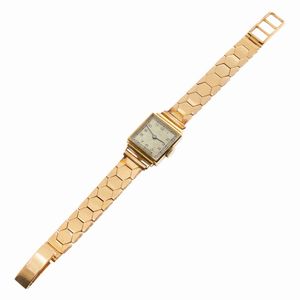peso 28 gr. anni 40/50 in oro giallo 18kt, cassa carré 1x11m. quadrante argentato con numeri arabi, movimento [..]
