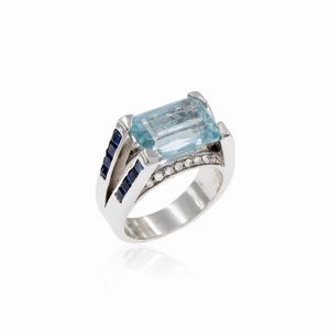 Anello in oro bianco 18kt con acquamarina diamanti e zaffiri