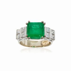 peso 19 gr. firmato Petochi ct 2,51 circa, ai lati diamanti taglio carré e princess ct 1 circa, colore G - purezza [..]