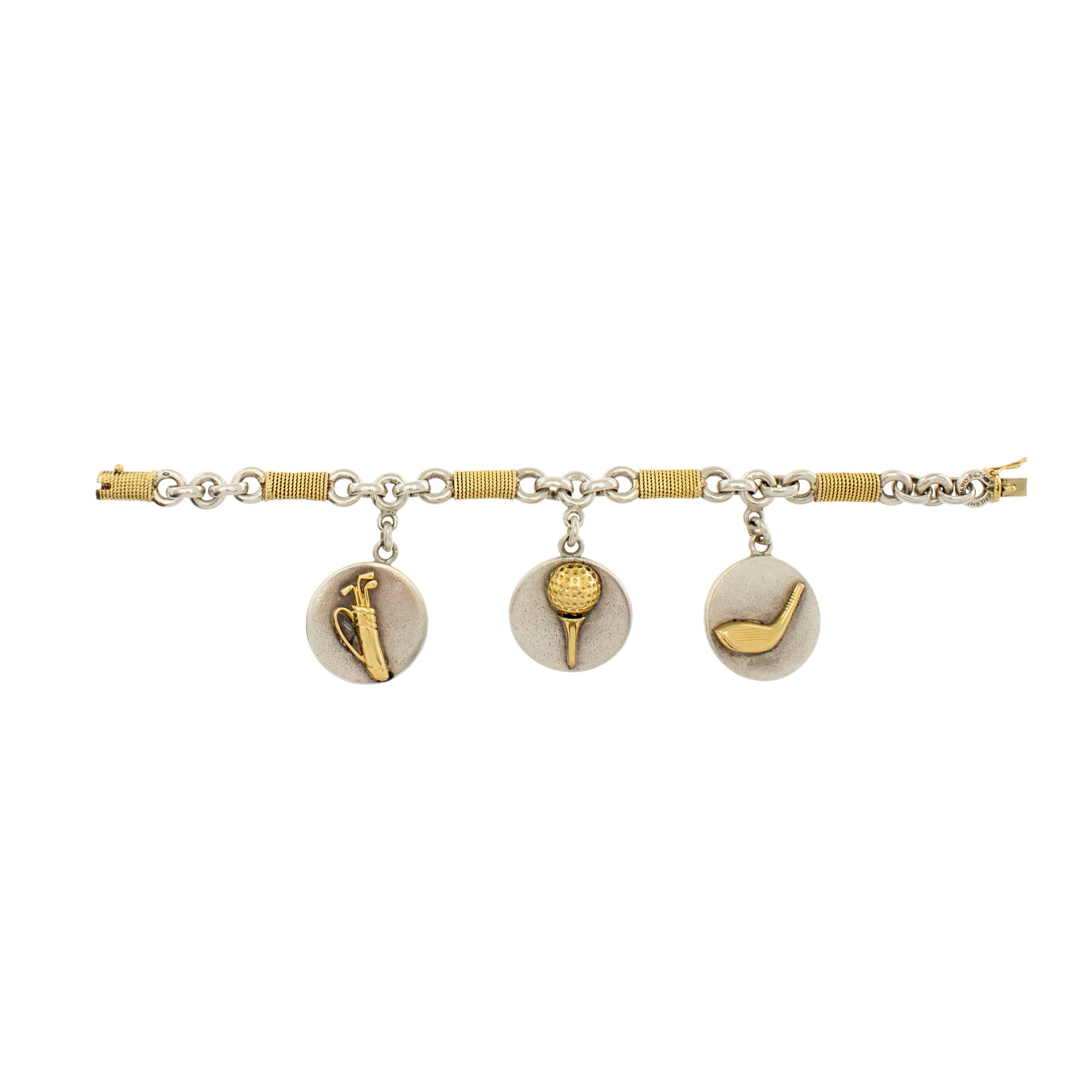 anni 70/80 in oro giallo 18kt e argento 925, tre pendenti a tema golf, lunghezza 18,5 cm.
