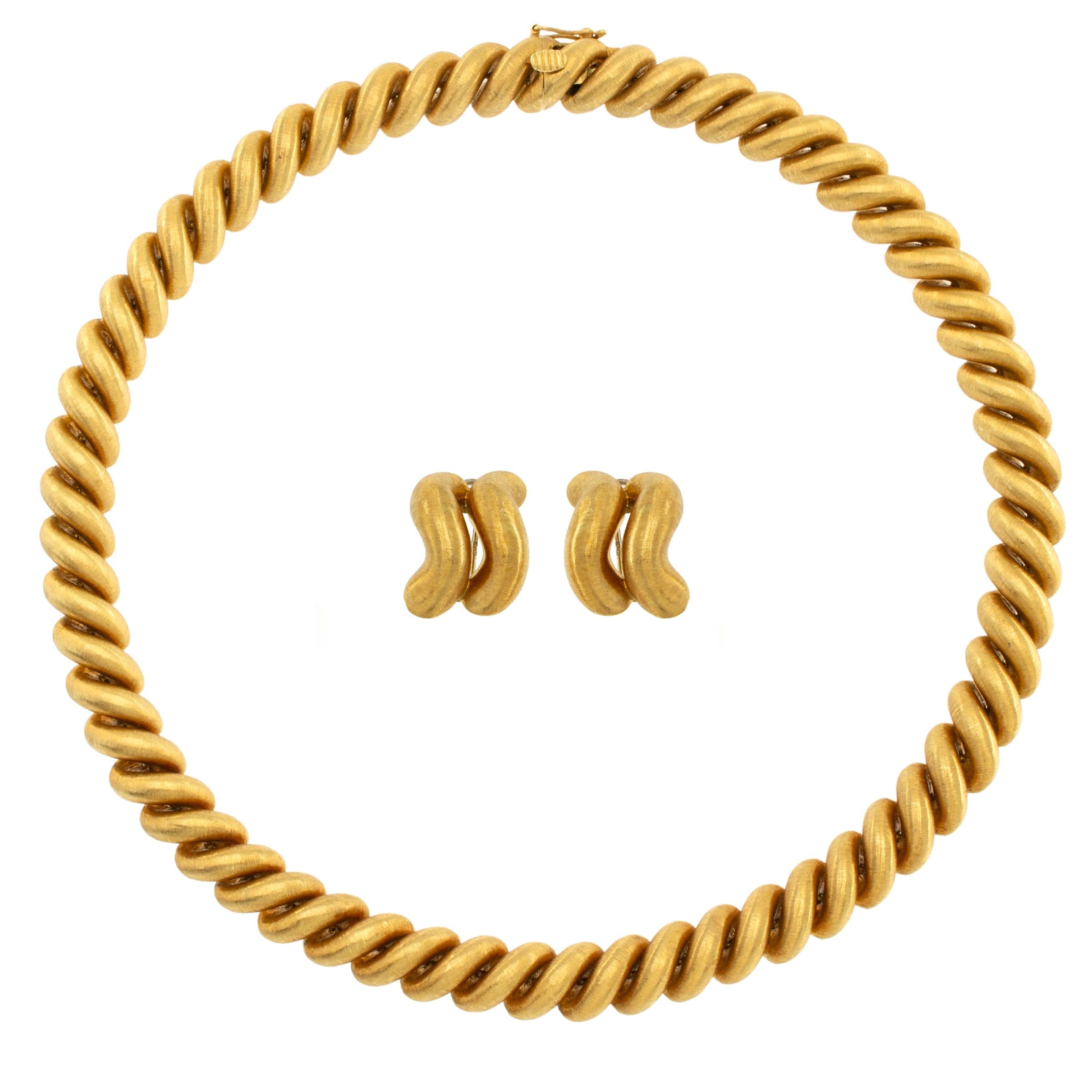firmata, anni 90 circa in oro giallo 18kt, composta da girocollo e orecchini a lobo, lunghezza 42 cm. e 3 cm.
