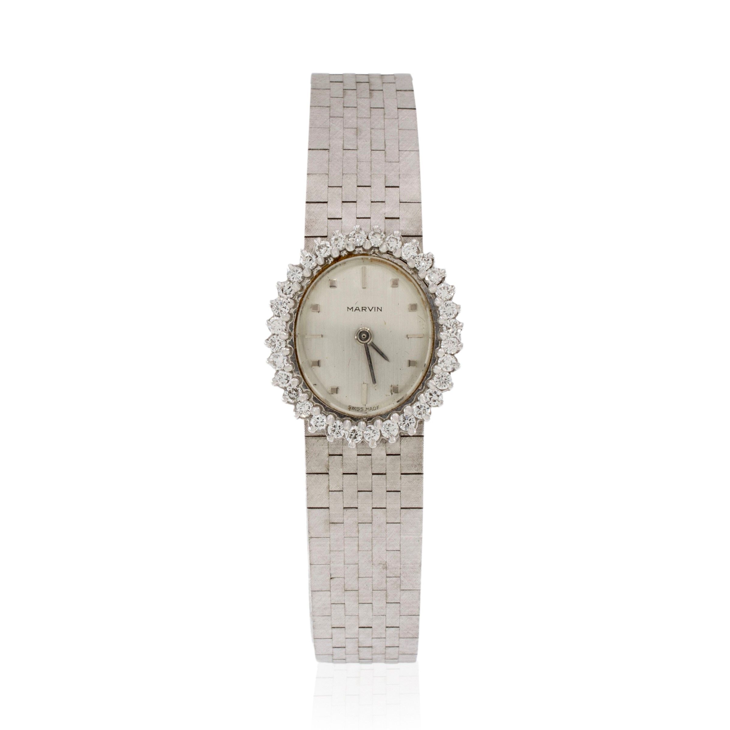 anni 60/70 in oro bianco 18kt, ref. 0415039, cassa ovale 22x18 mm. ghiera con diamanti taglio brillante ct 0,60 circa, quadrante argentato con indici, movimento meccanico a carica manuale, bracciale in oro bianco 18kt, chiusura regolabile, lunghezza 17,5 cm.