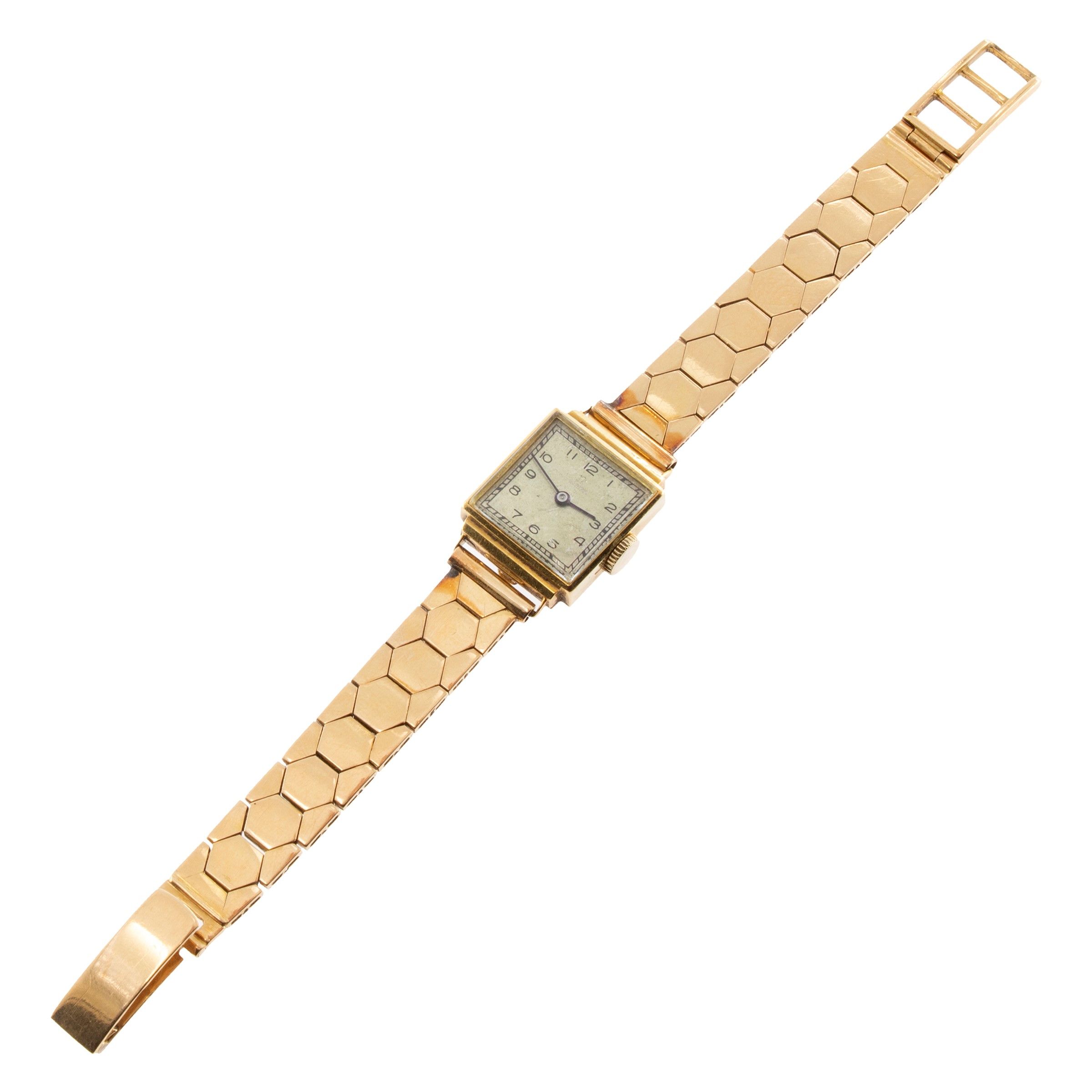 anni 40/50 in oro giallo 18kt, cassa carré 1x11m. quadrante argentato con numeri arabi, movimento meccanico a carica manuale, calibro 244, bracciale in oro giallo 18kt, lunghezza regolabile 15,5 cm.