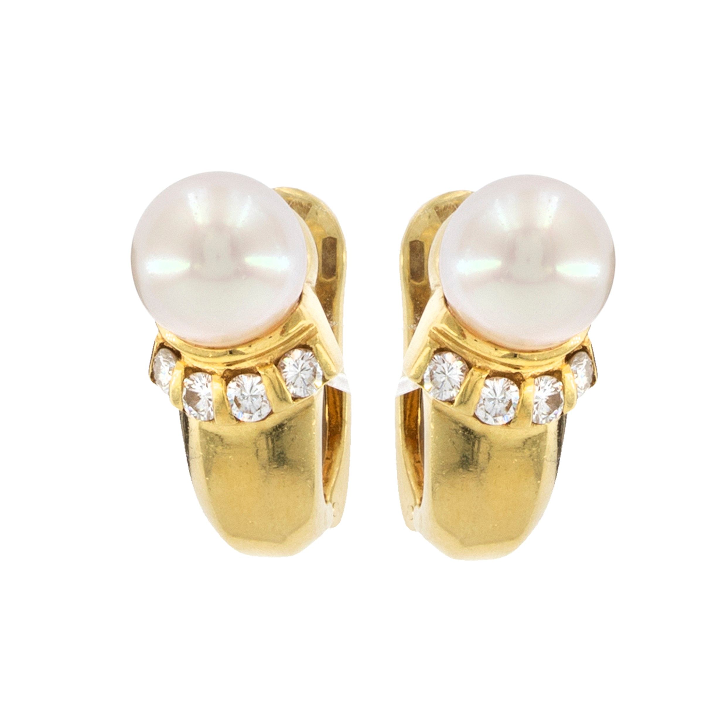 Orecchini a lobo in oro giallo 18kt perle coltivate e diamanti