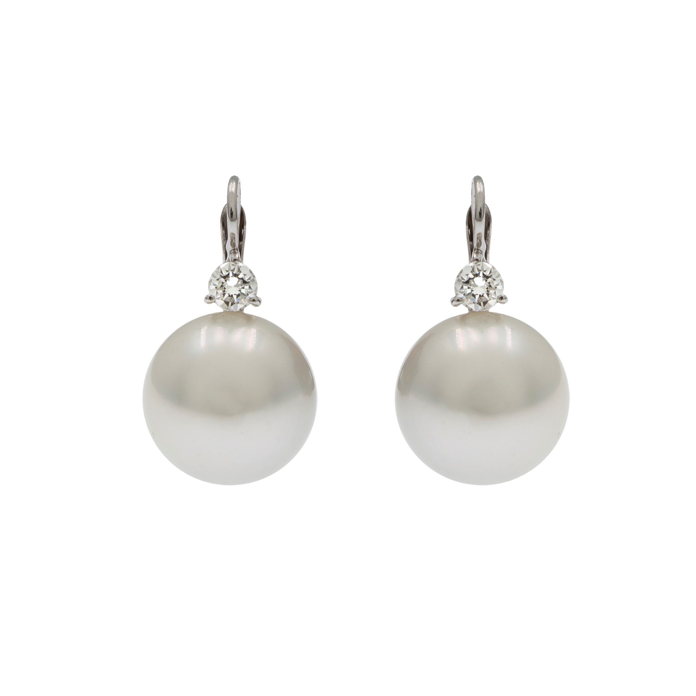 perle australiane 14 mm. circa sormontate da due diamanti taglio brillante ct 0,48 circa, lunghezza 2,5 cm.