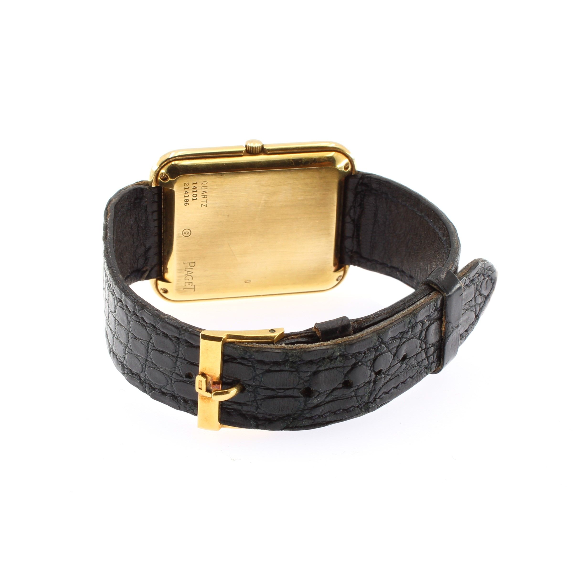 anni 70 circa in oro giallo 18kt, ref. 14101 - 214186 - 206, cassa rettangolare a scalini 41x33,5 mm. quadrante blu- grigio con indici dorati, lancette segni di usura, vetro zaffiro, movimento al quarzo, cinturino in pelle con fibbia originale in oro giallo 18kt, cassa, quadrante e movimento firmati,