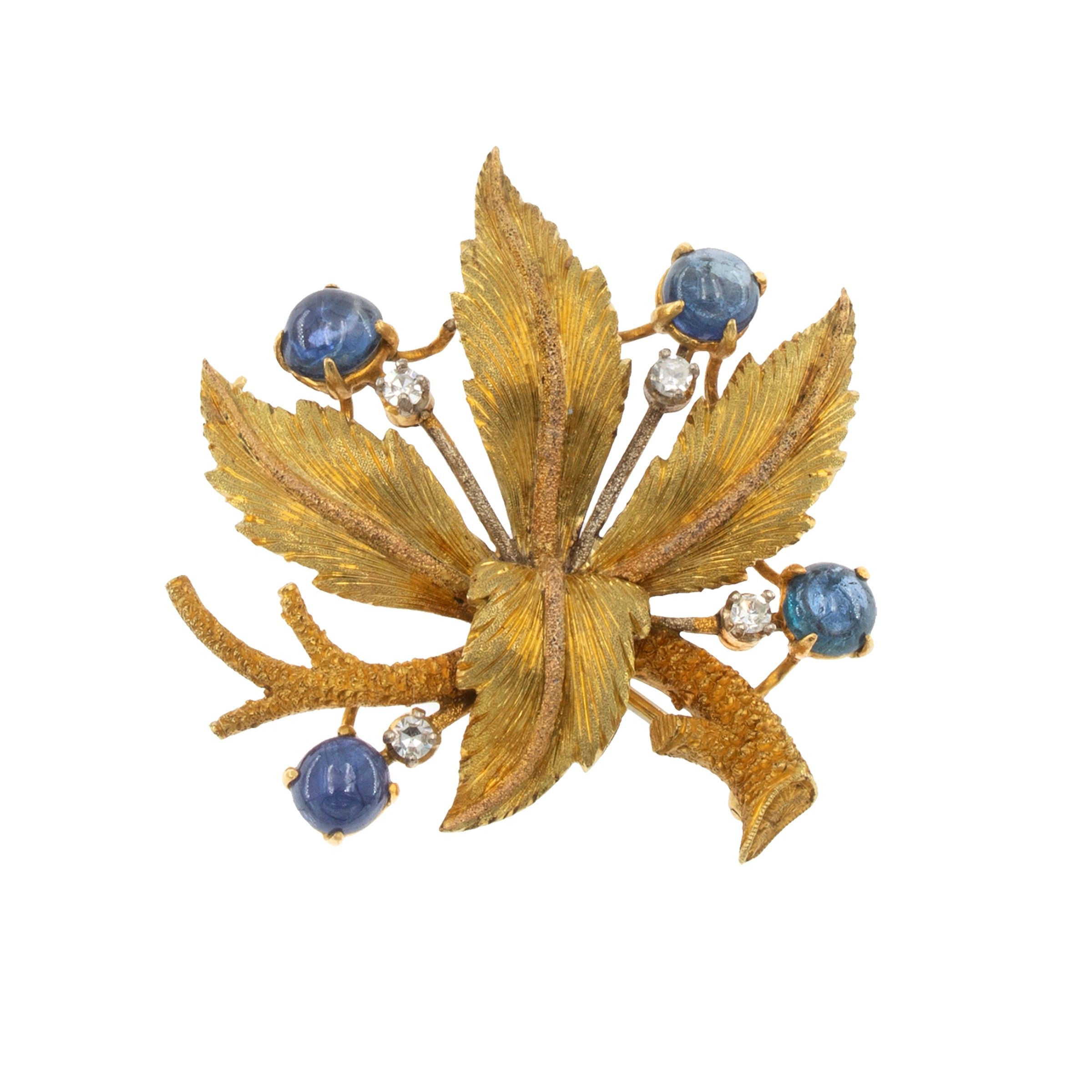 anni 50/60 zaffiri taglio cabochon ct 1,50 circa e diamanti taglio brillante, dimensioni 4,3x4 cm.