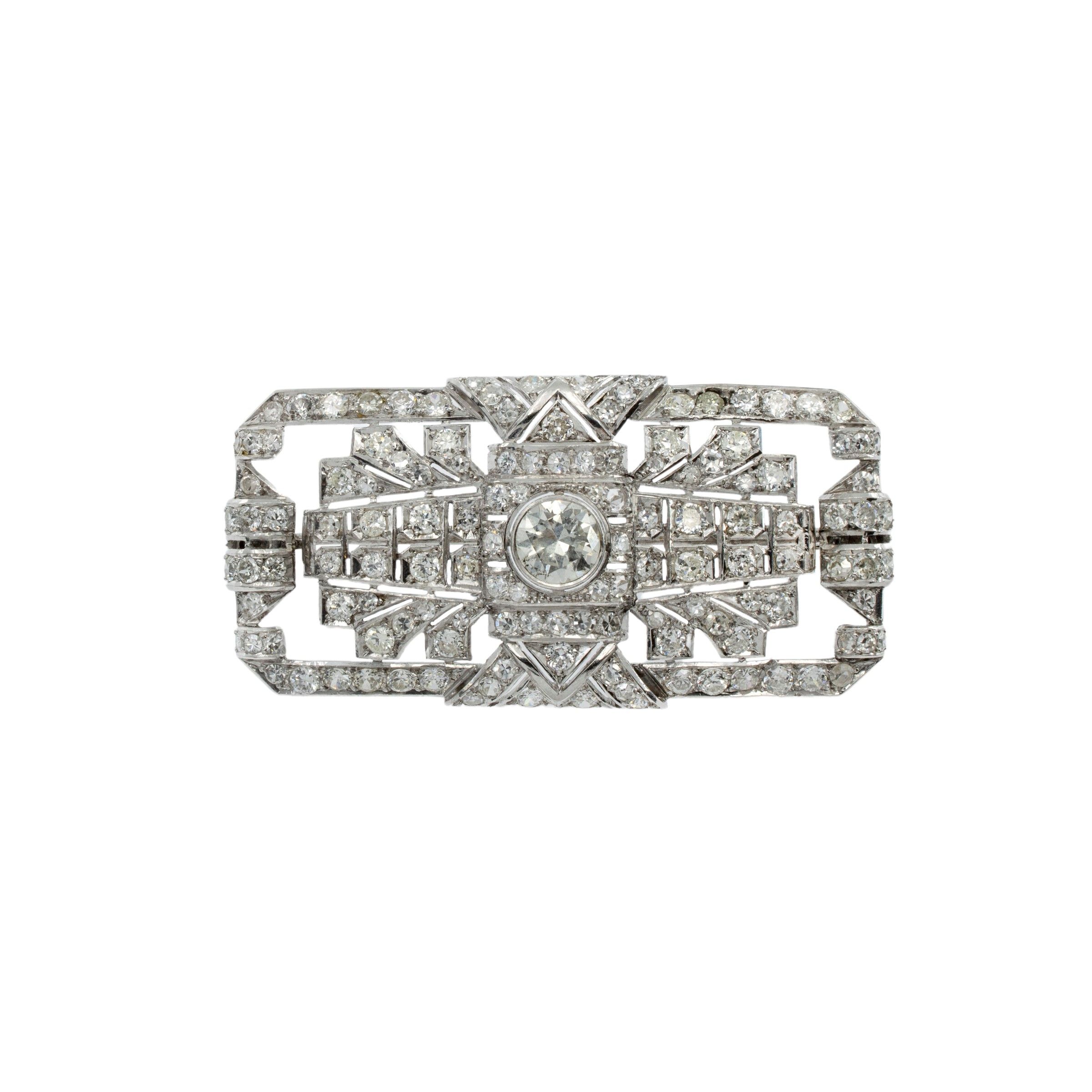 anni 40/50 taglio brillante, un diamante ct 1 circa contornato da diamanti taglio brillante ct 3,50 circa, una pietra mancante, dimensioni 5,5x2,8 cm.