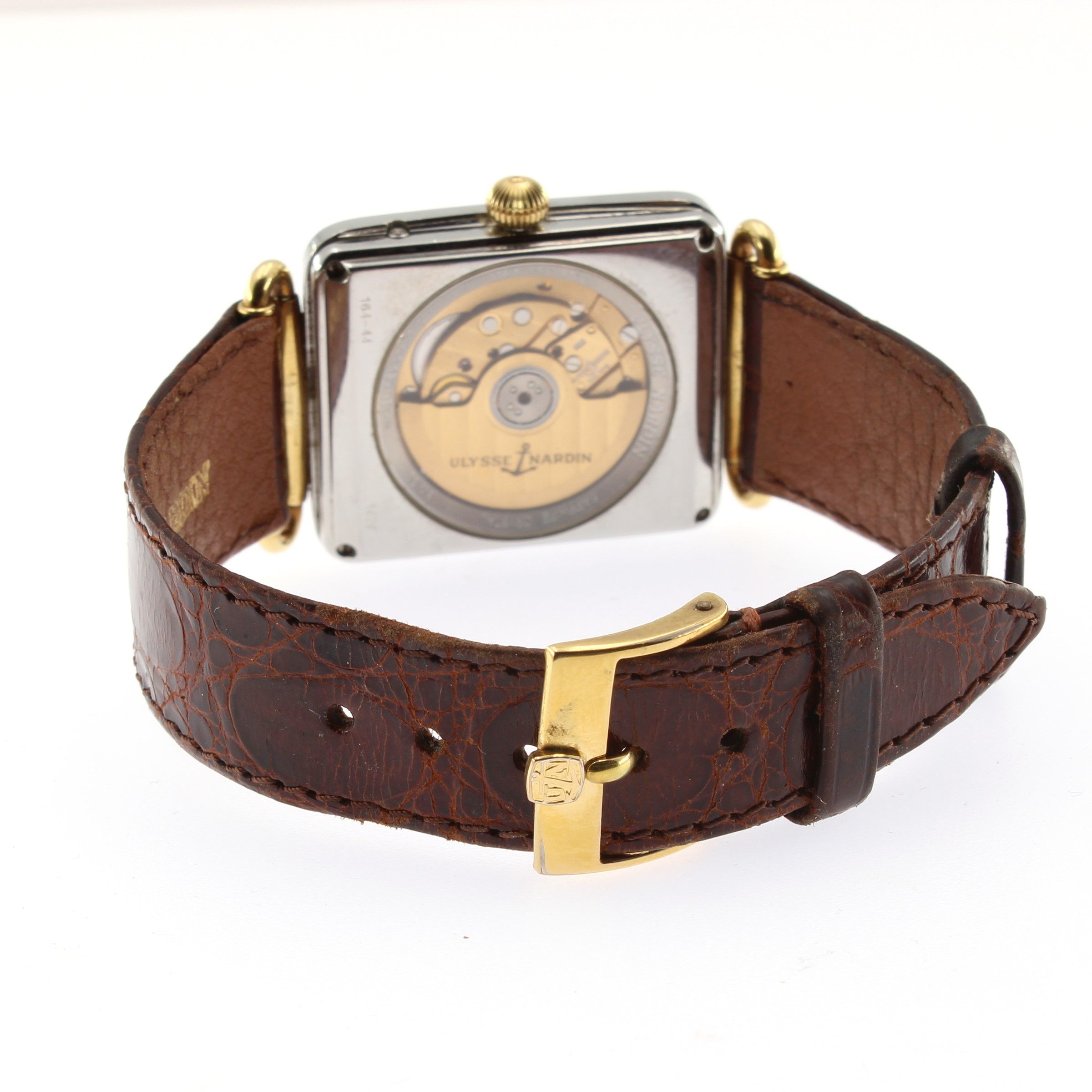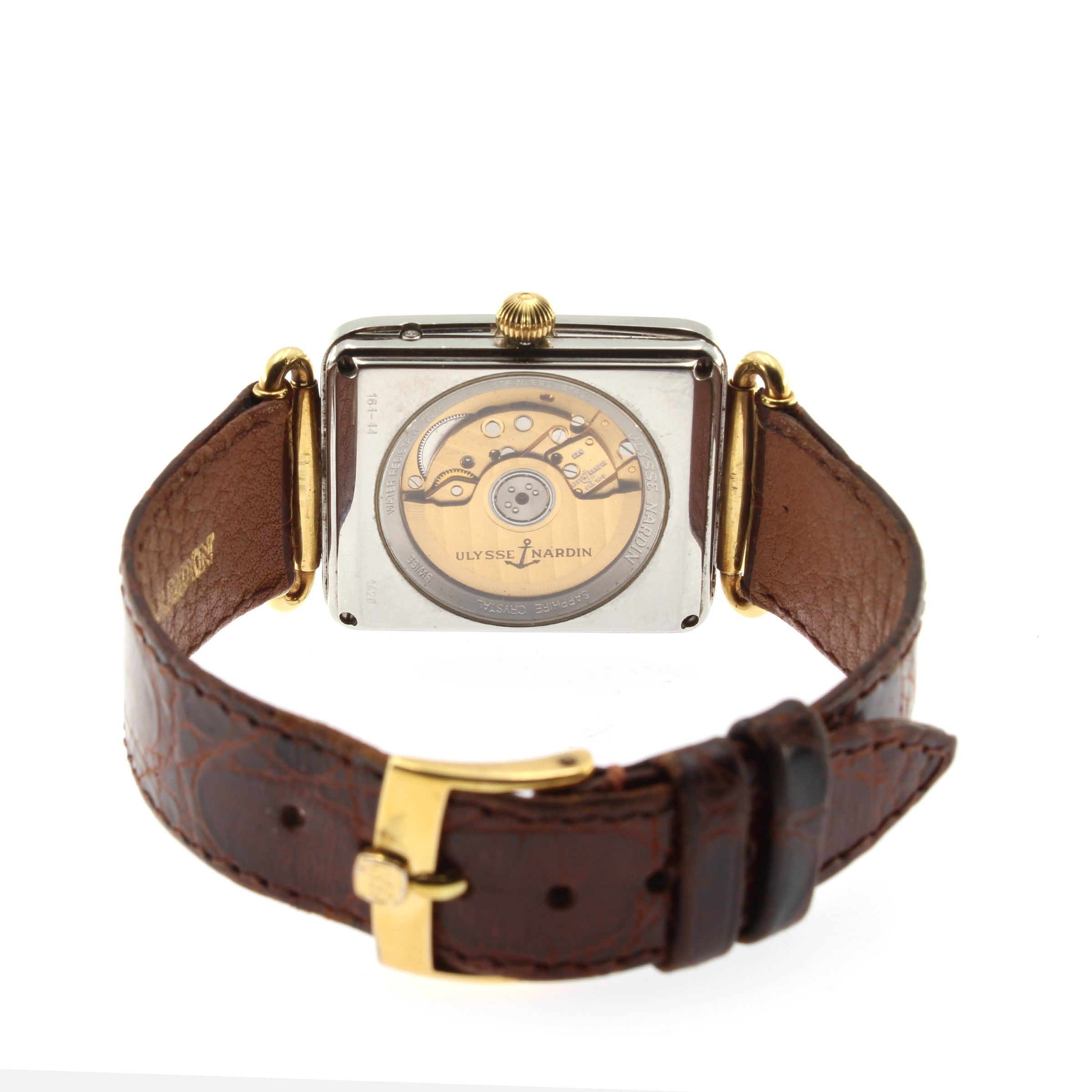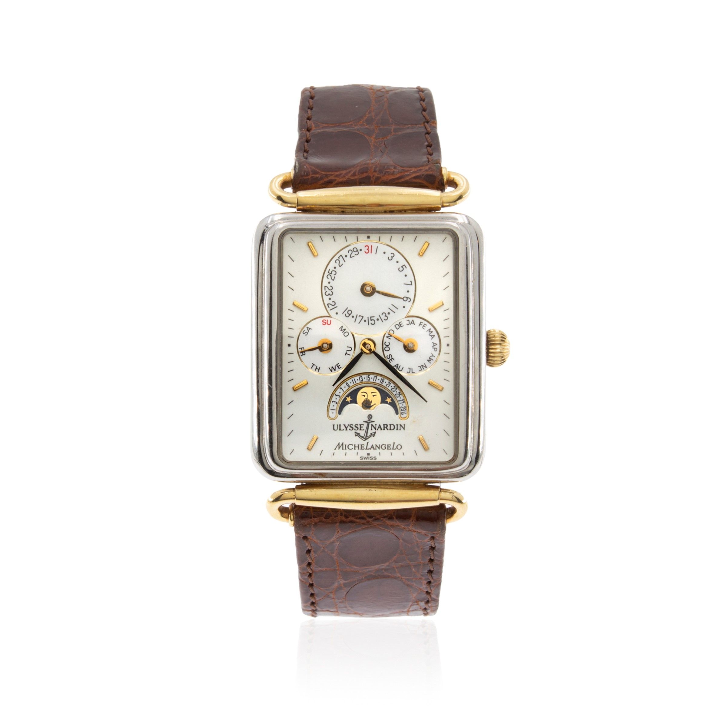 anni 80/90 in acciaio e oro giallo 18kt, ref. 164-44 /1425, cassa rettangolare 34x29 mm. anse mobili, calendario completo quadrante argentato con indici, quattro quadranti ausiliari, tre in madreperla per data, giorni, mesi e fasi lunari, vetro zaffiro, movimento scheletrico meccanico a carica automatica, calibro 16-5, cinturino in pelle con fibbia originale, cassa, quadrante e movimento firmati, completo di scatola, garanzia e chiavetta