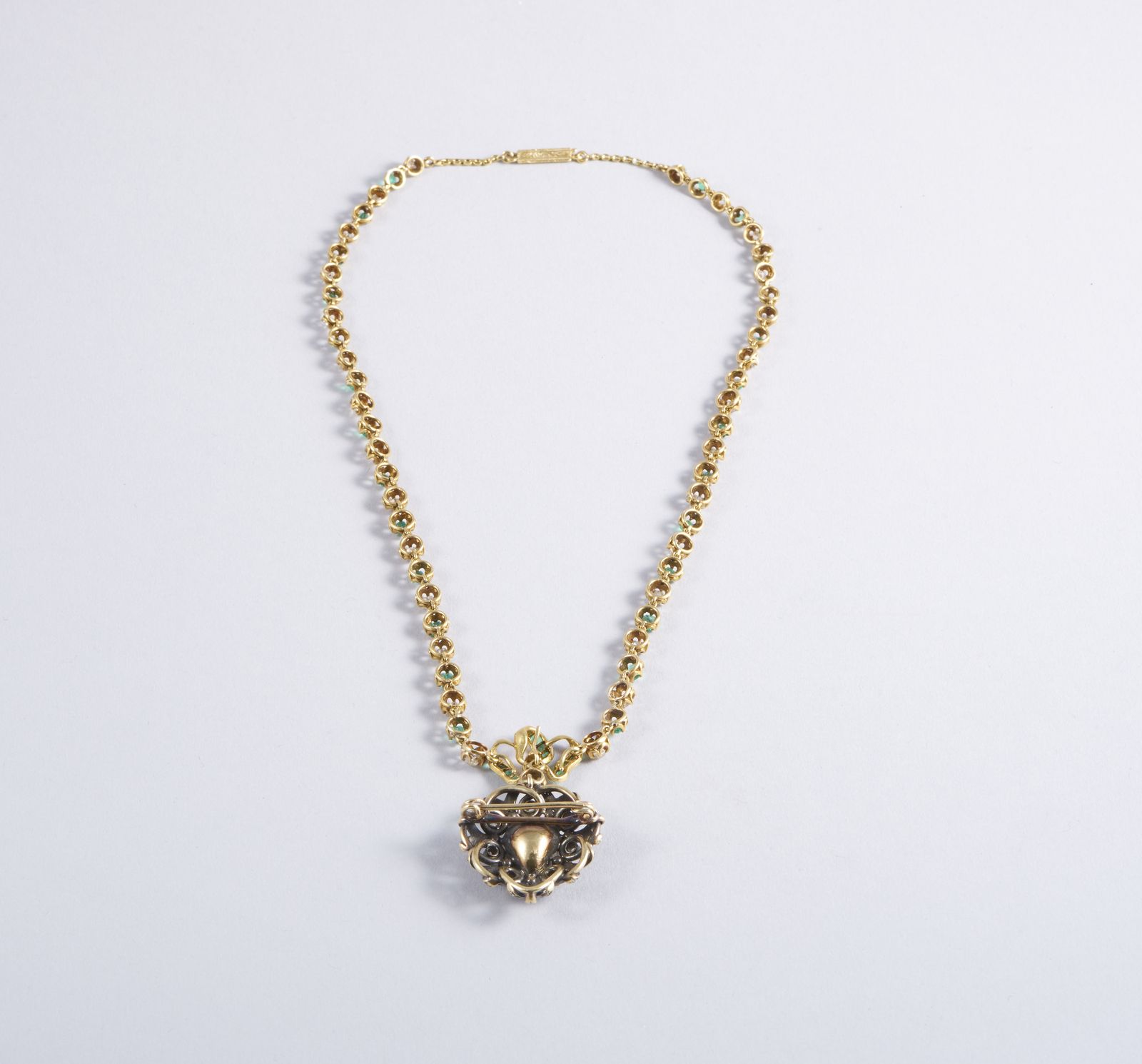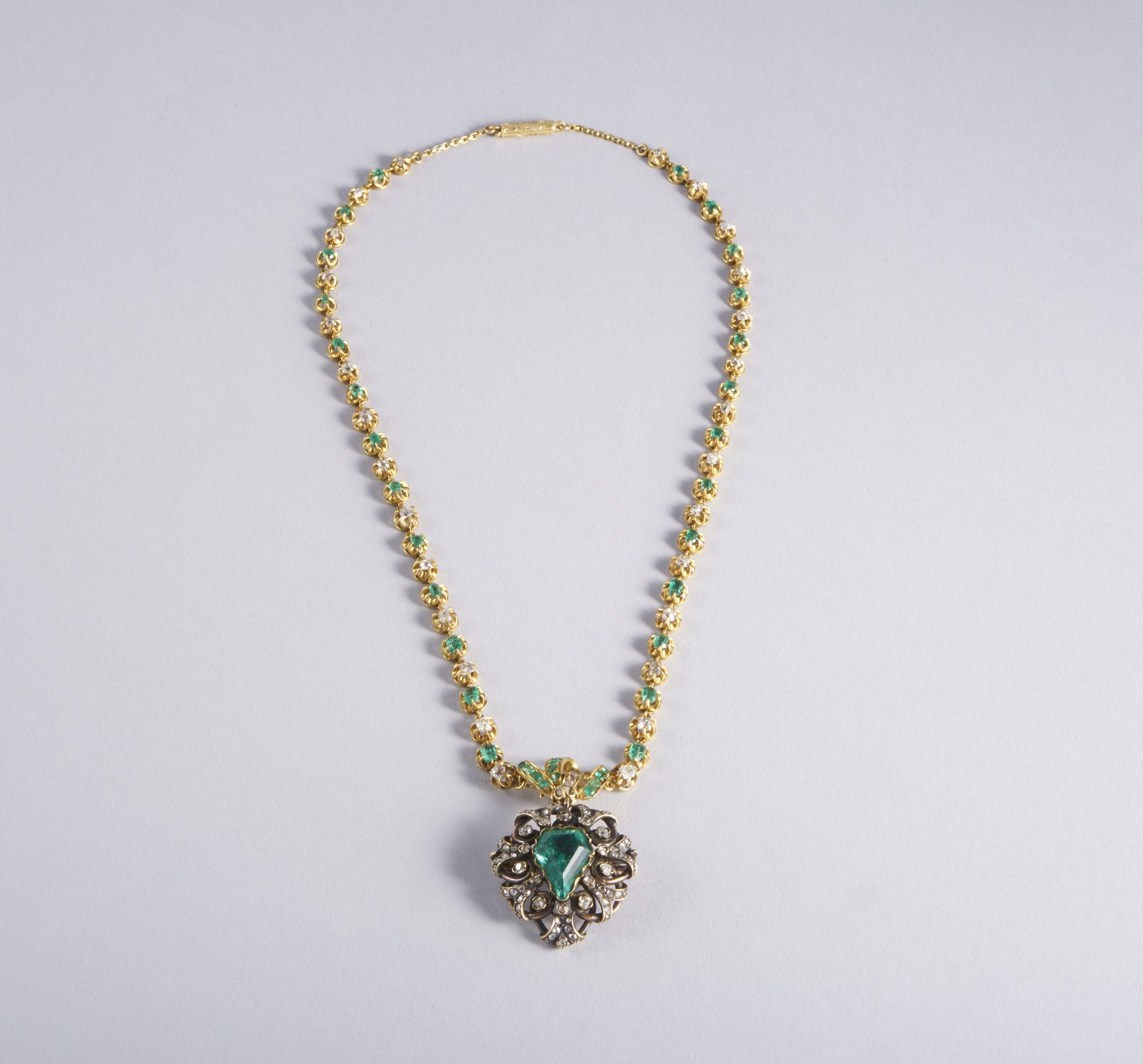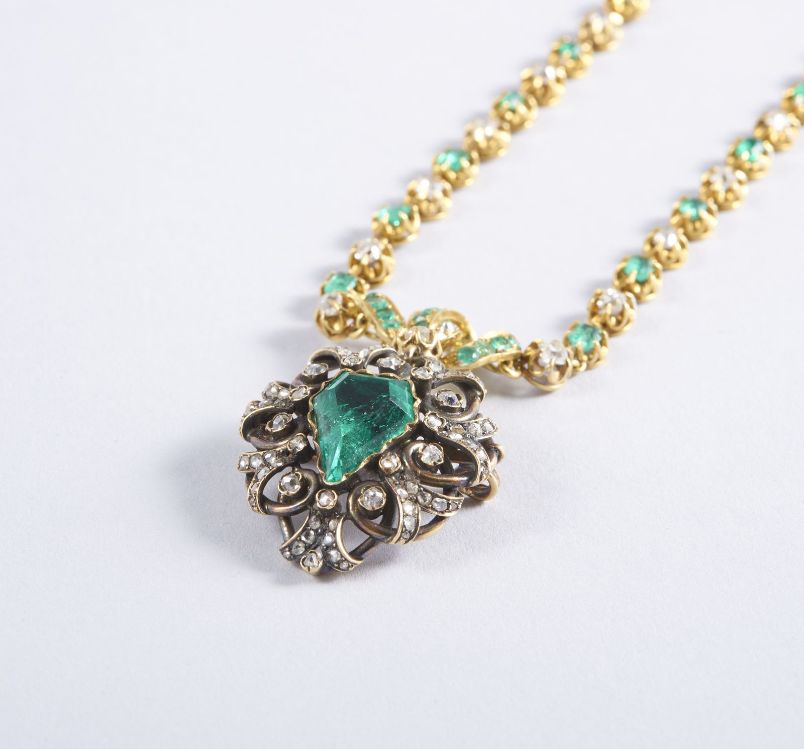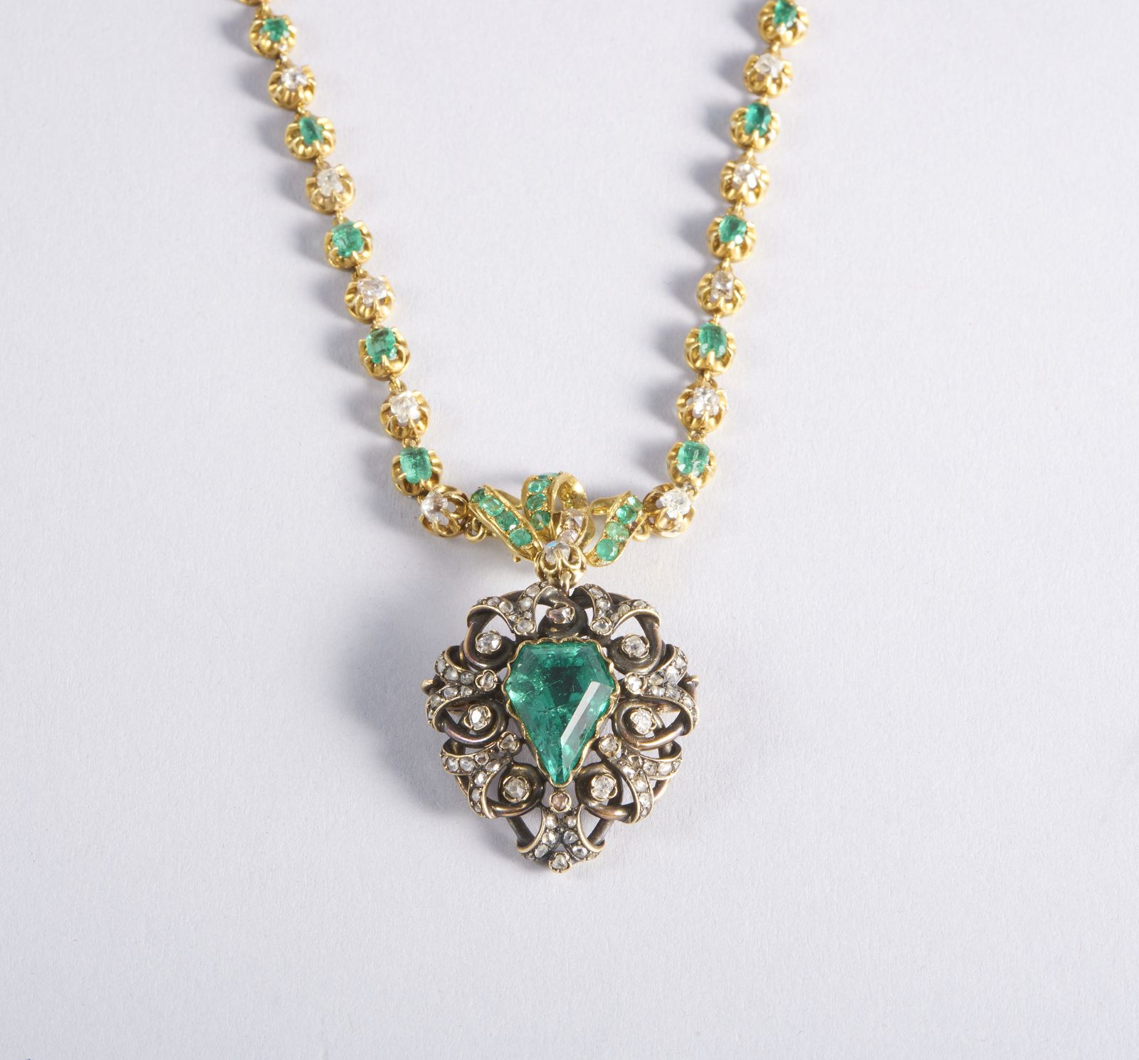 Collana in oro 18k con 38 smeraldi taglio smeraldo. di 5 c,50 ct. ca e 28 diamanti bianchi taglio antico di 3,30 ct. ca. Peso lordo della collana : 21,50 grammi Peso lordo totale: 32,40 grammi Probabile provenienza del ciondolo Borbonica. Presente certificato IGI, settembre 2023