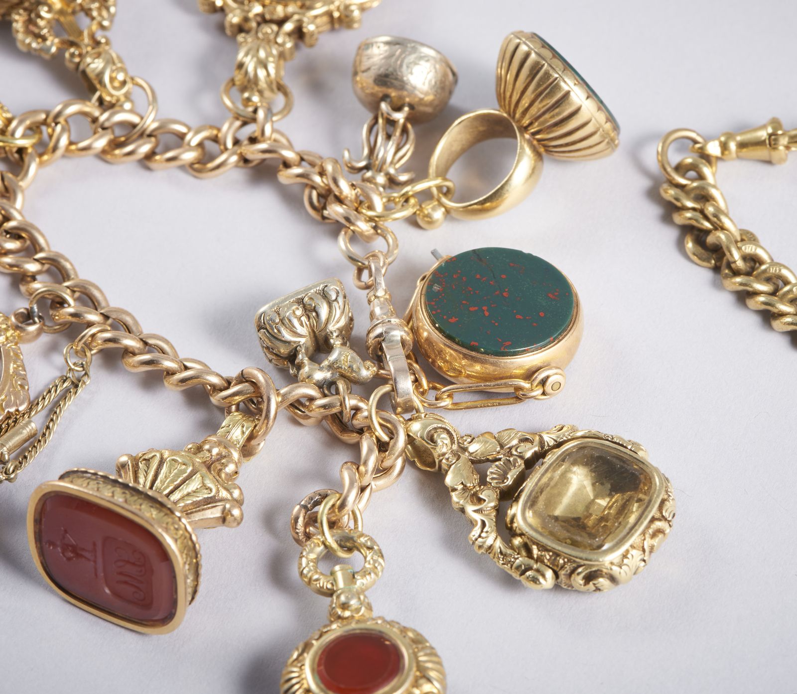 Corniola incisa, pietra dura semipreziosa e diaspro. Peso lordo bracciale: 158,70 grammi.