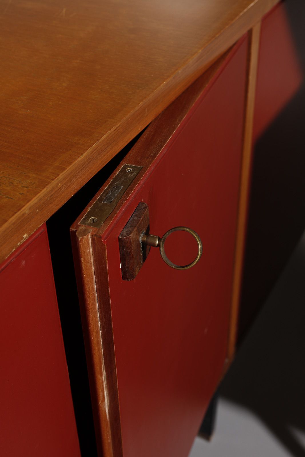 Anni Sessanta.Piano bar: 111 x 142 x 53 cmCredenza: 82 x 232 x 201 cmSgabelli: 72 x 27 cmMobile a parete: 73 x 72 x 27 cmProfondità angolo: 145 cm