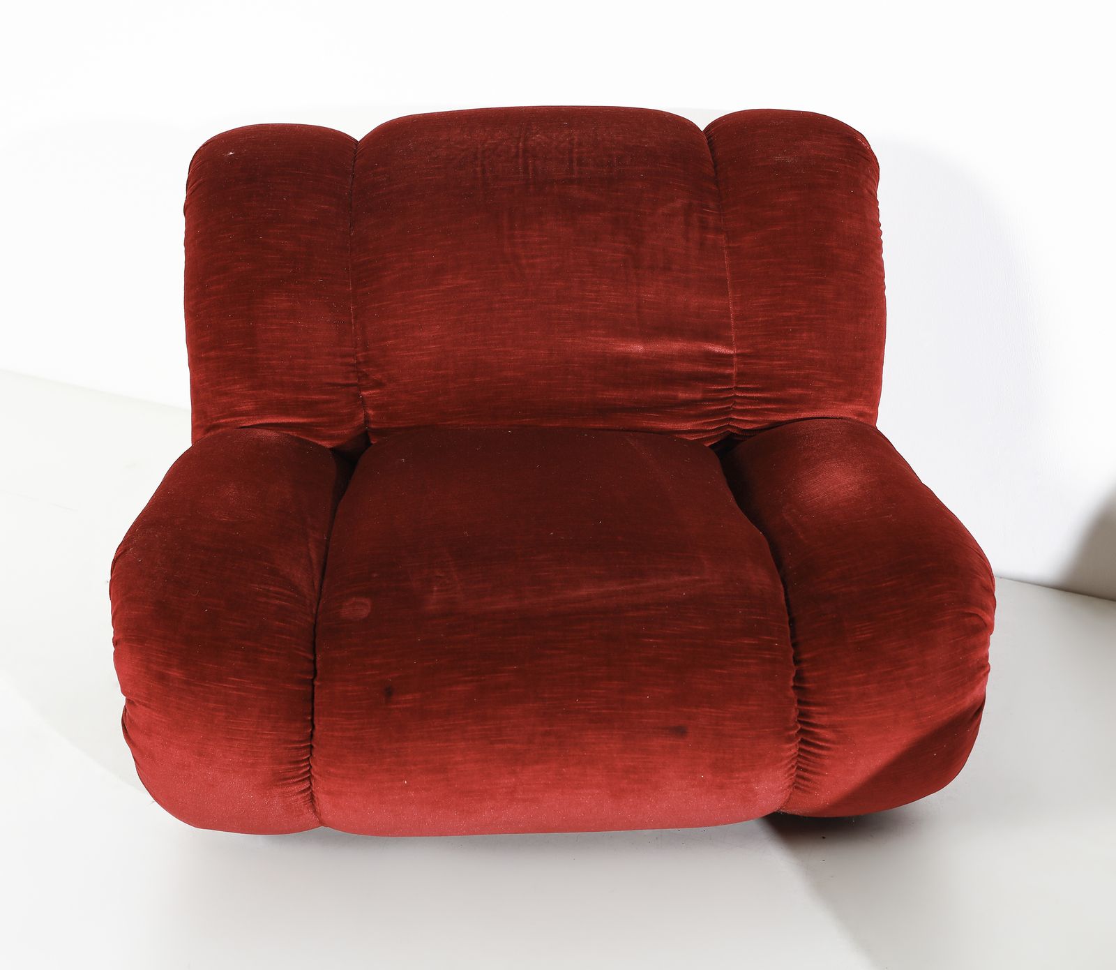 Anni Settanta.Dimensioni: poltrone 70 x 90 x 94 cm. poggiapiedi 30 x 65 x 65 cm.