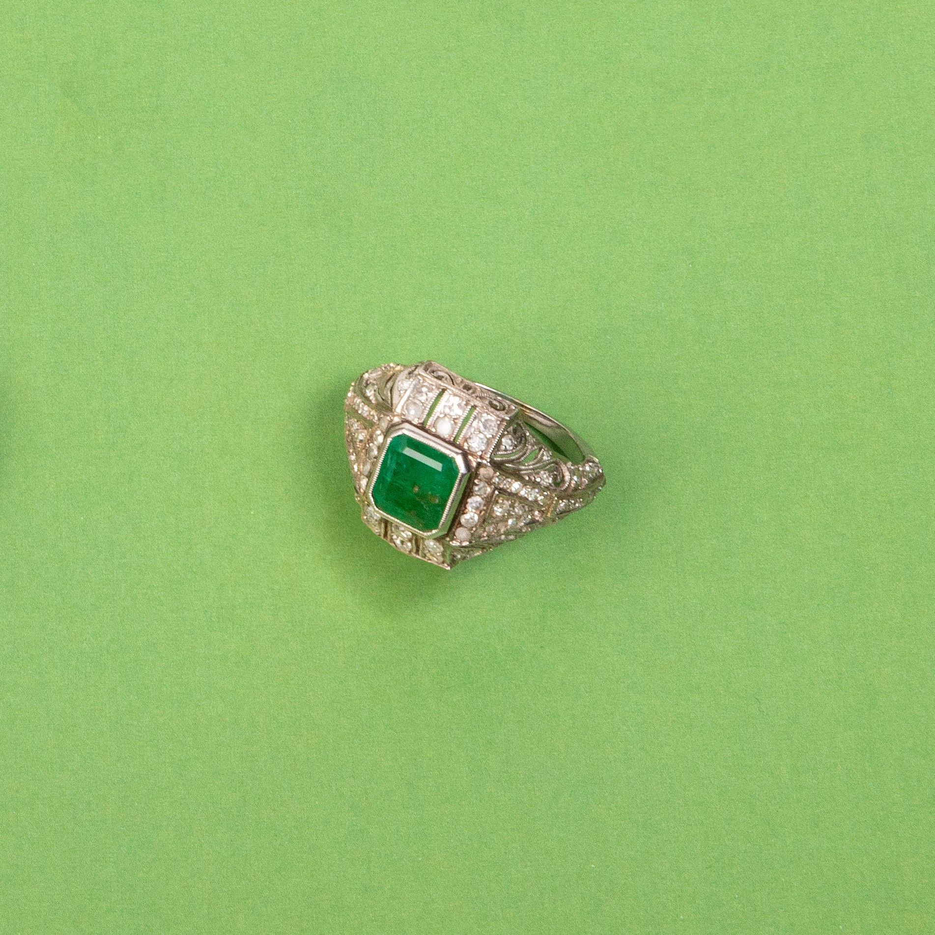 Anello a fascia bombata e traforata in oro bianco con smeraldo e diamanti