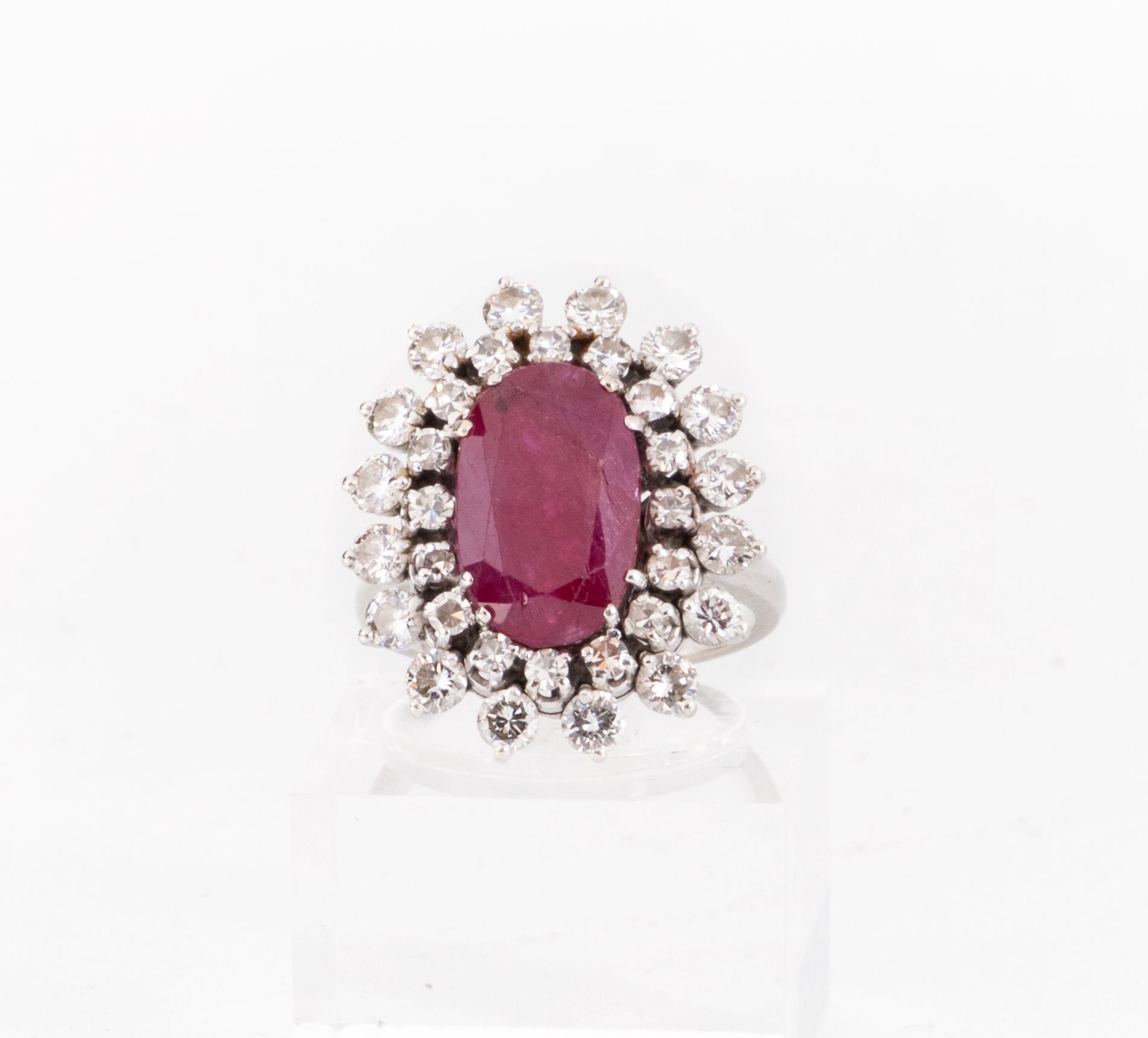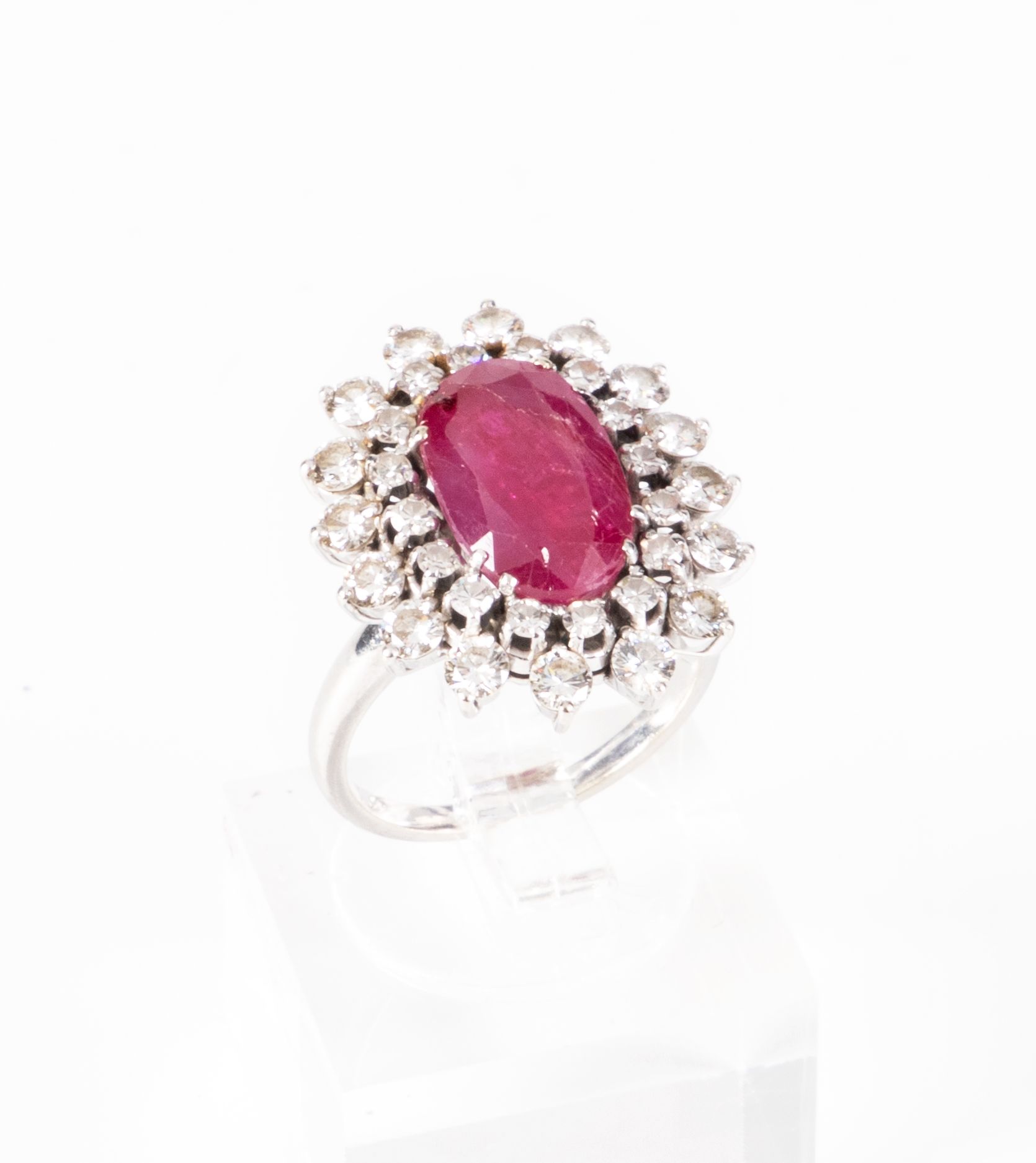 oro 18 kt, rubino ct 3,00 ca., diamanti ct 1,20 ca., misura 16, g 7,5.