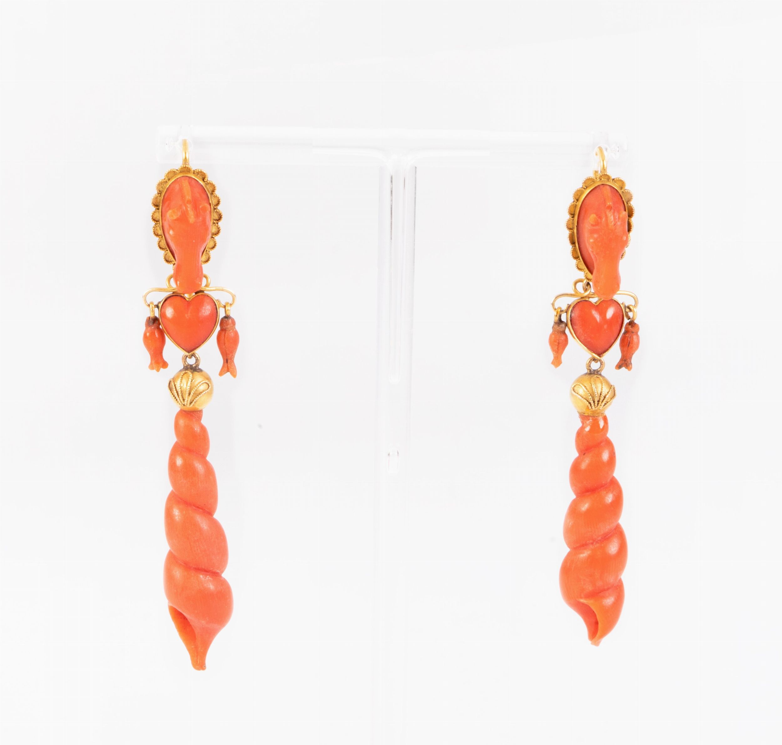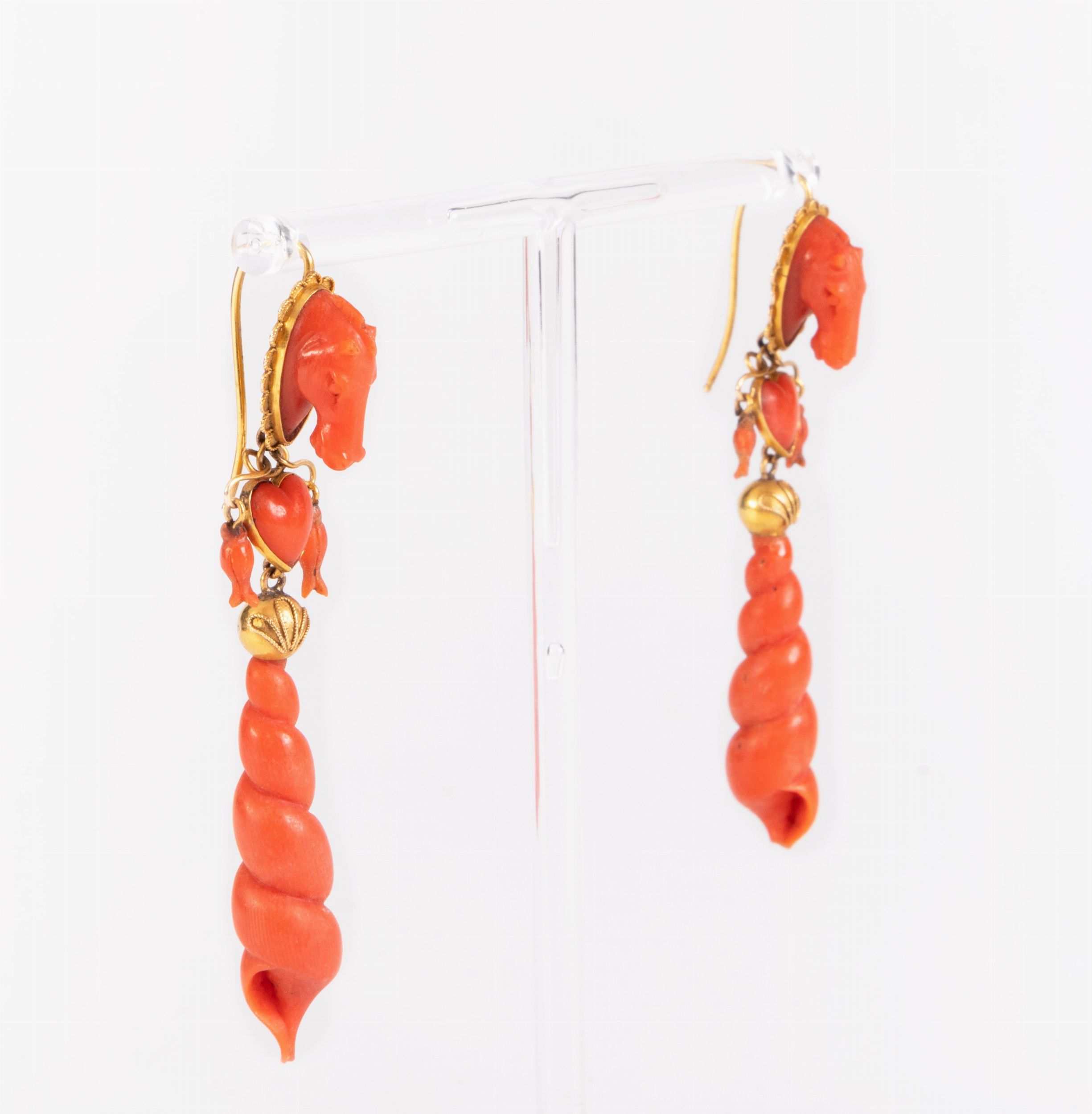 Antichi orecchini pendenti in oro giallo e corallo