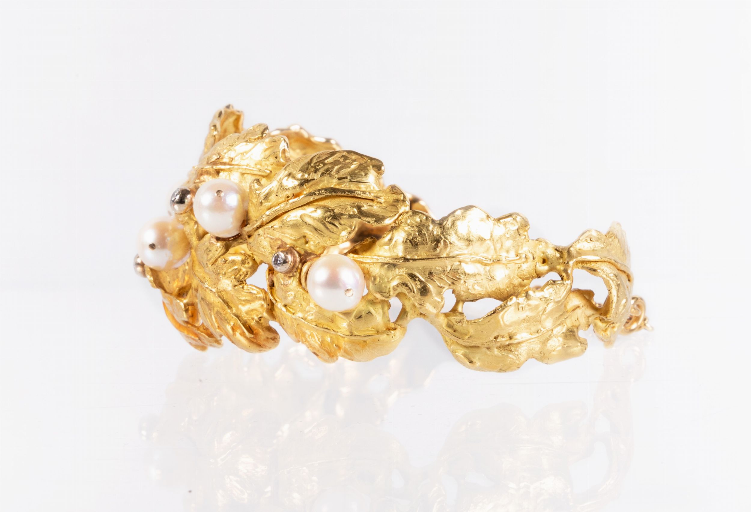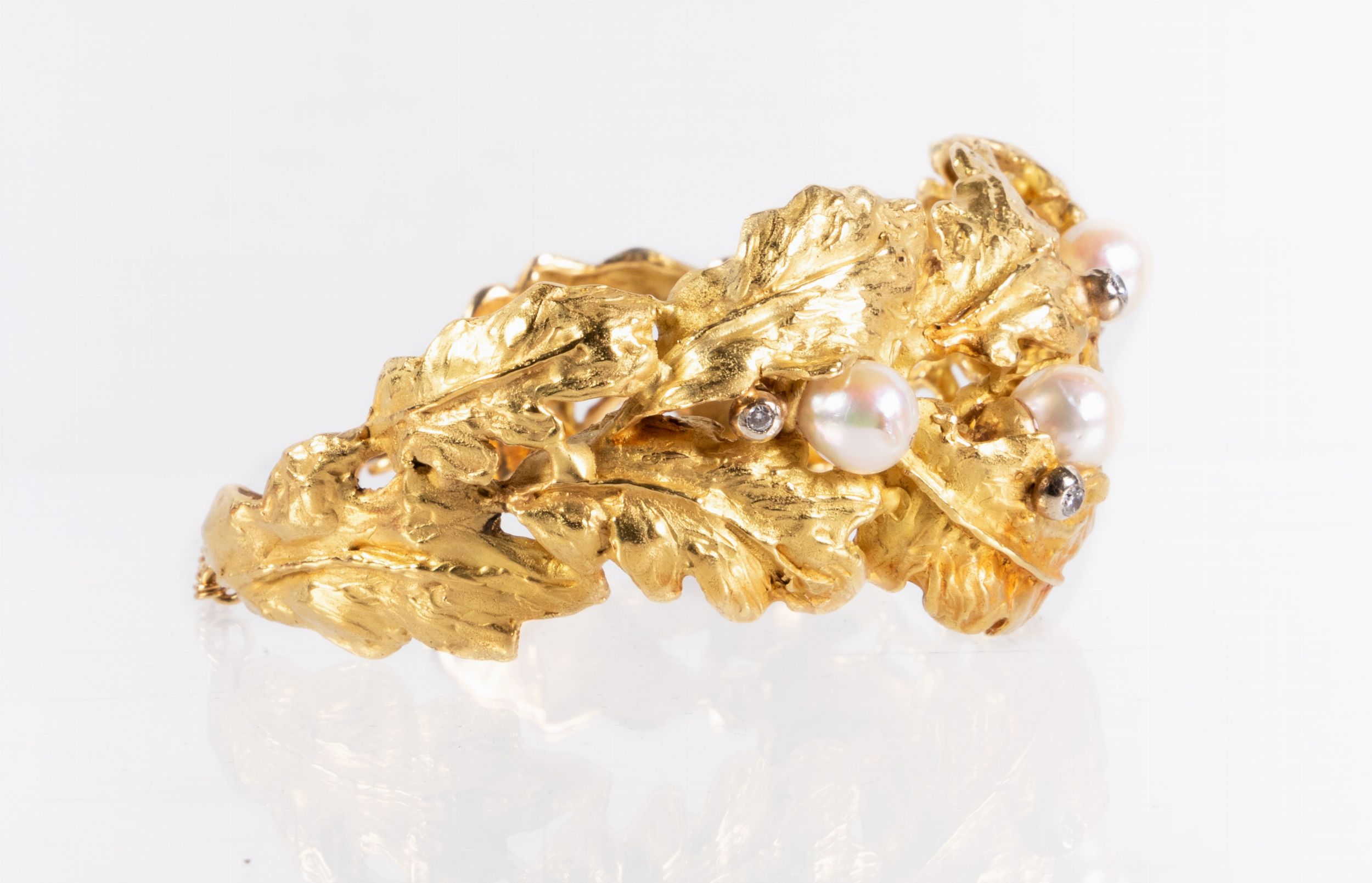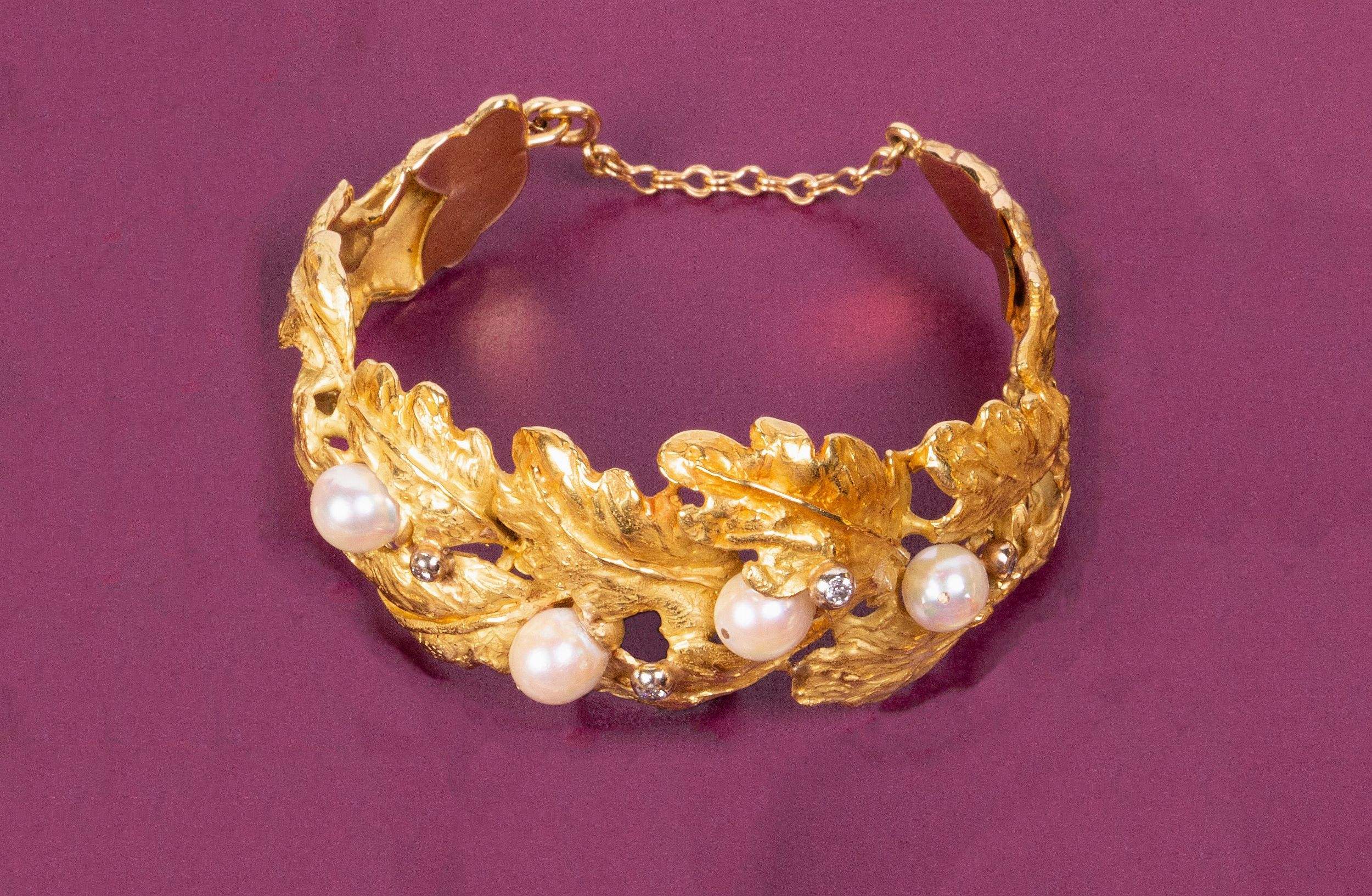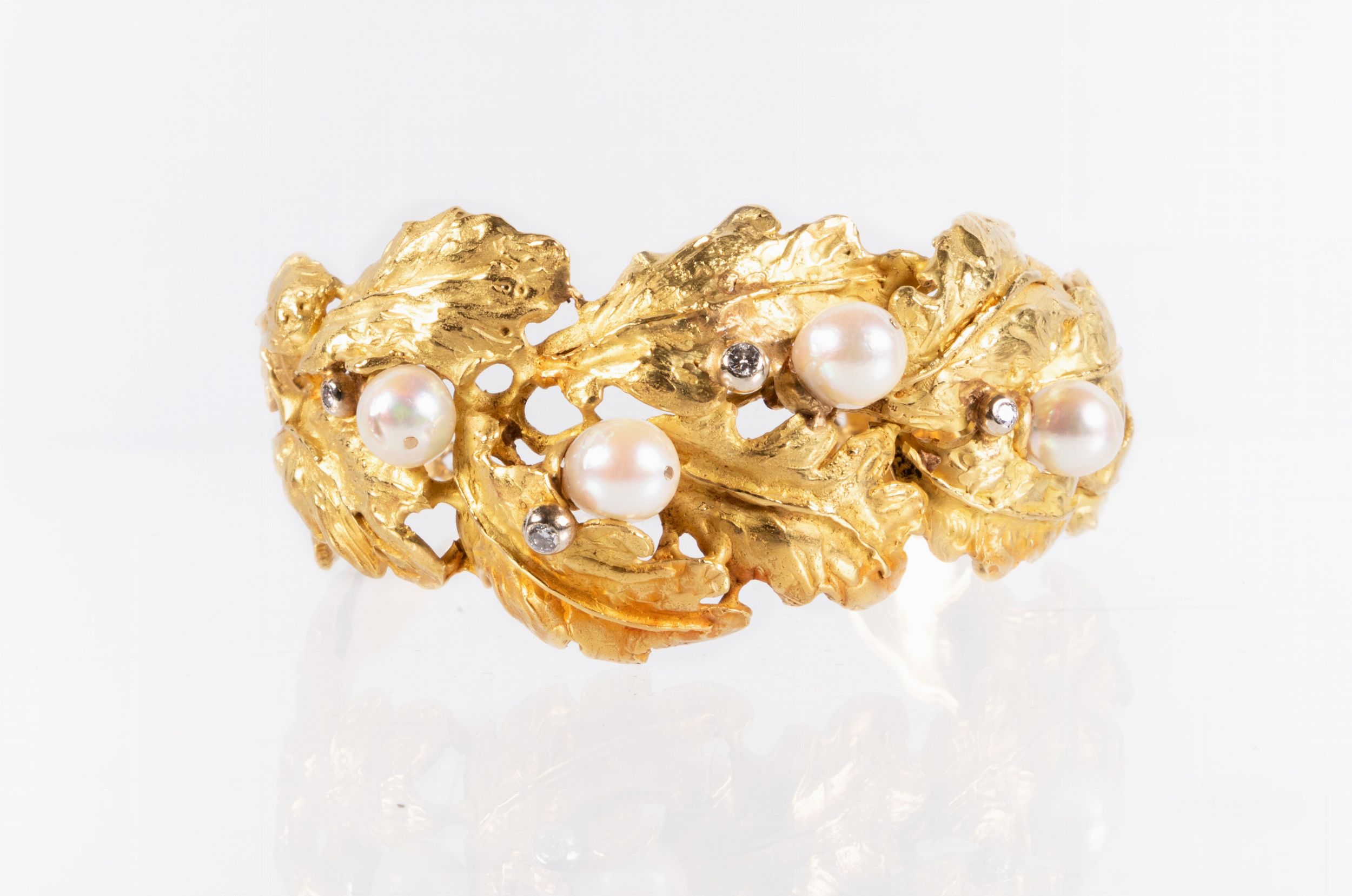 Bracciale a tralcio di foglie in oro giallo con perle e diamanti