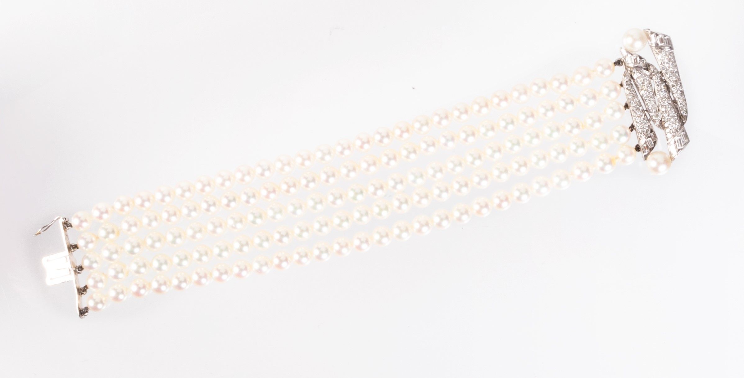 oro 18 kt, lunghezza cm 19, perle mm 6 ø, diamanti ct 1,50 ca.