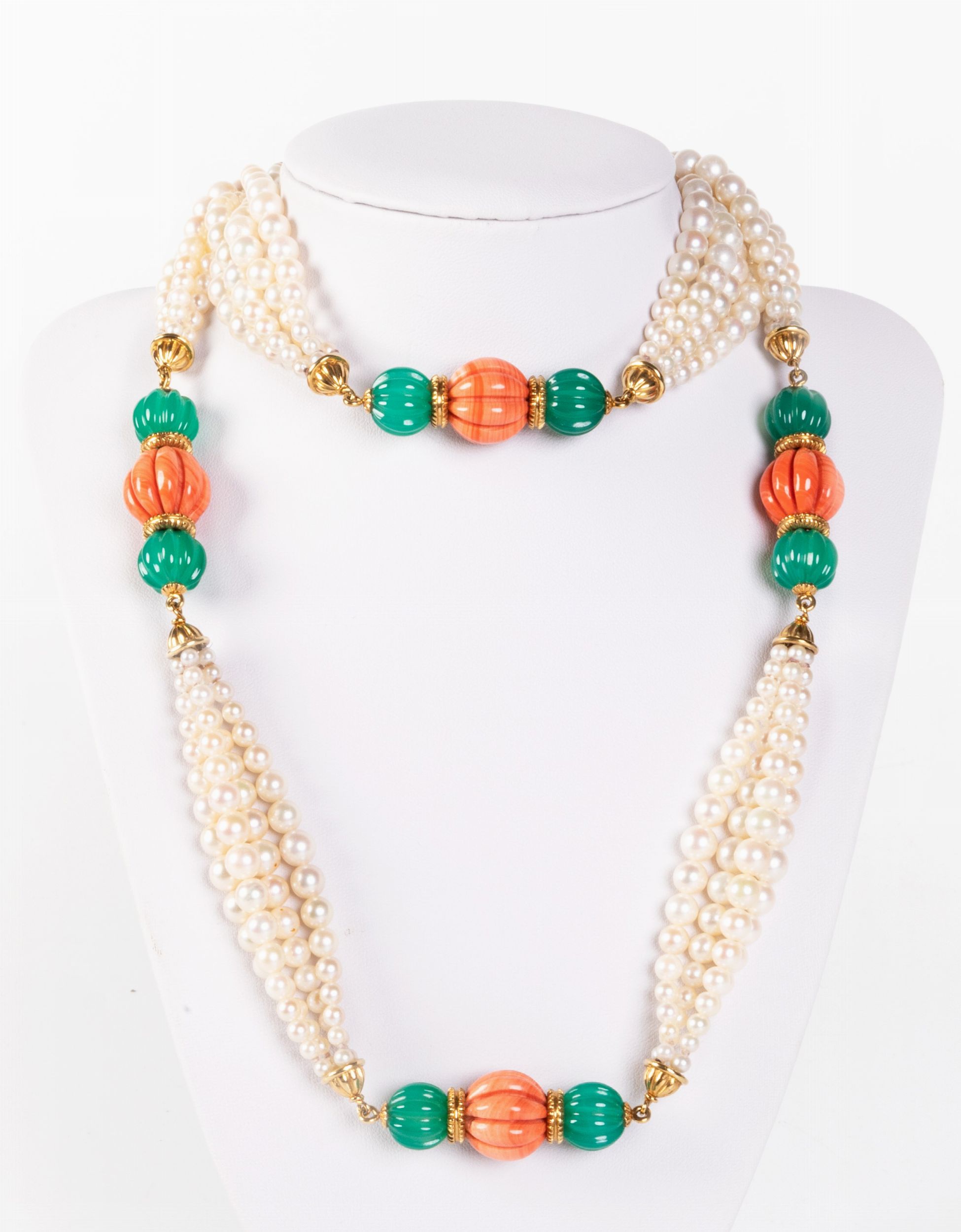 lunghezza cm 78 ca., agata mm 14 ø, calcedonio mm 11 ø, perle da mm 3 ø a mm 6 ø.