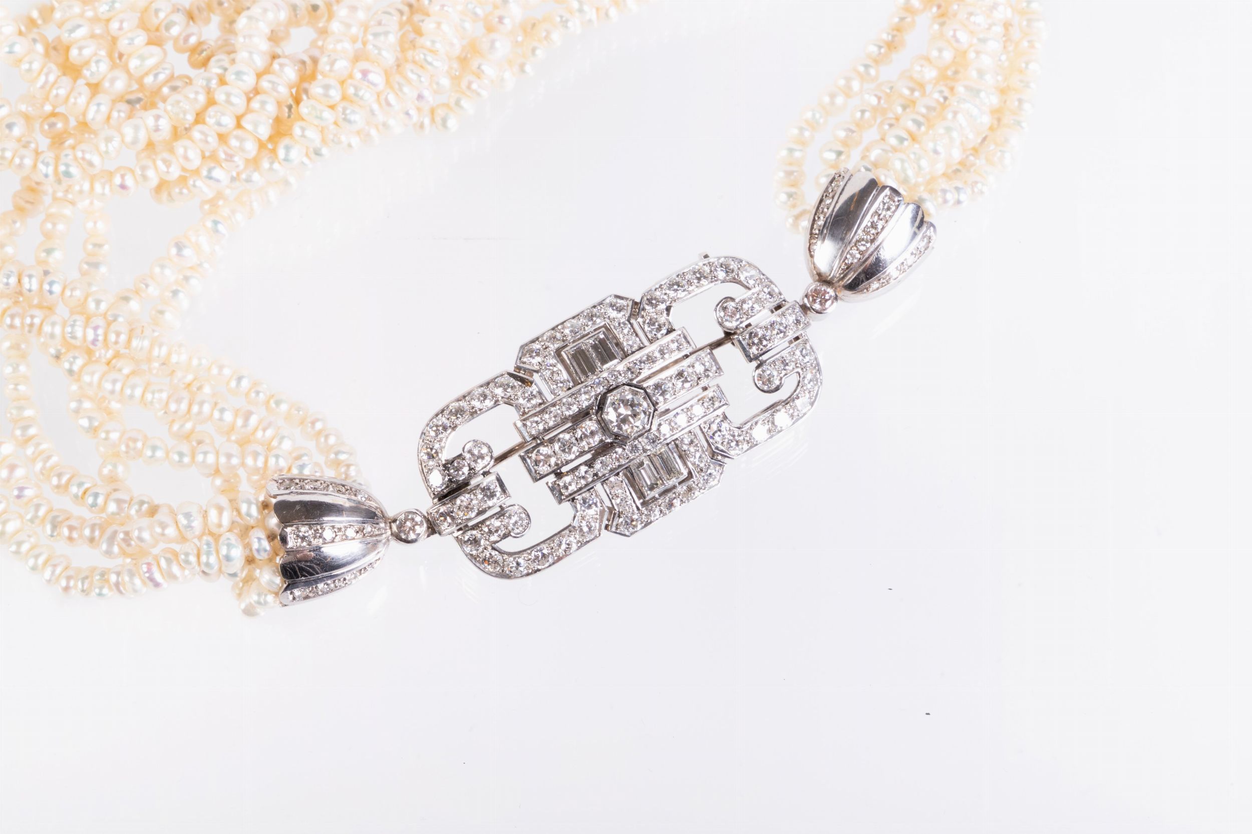 Collana girocollo di perle con spilla in oro bianco e diamanti