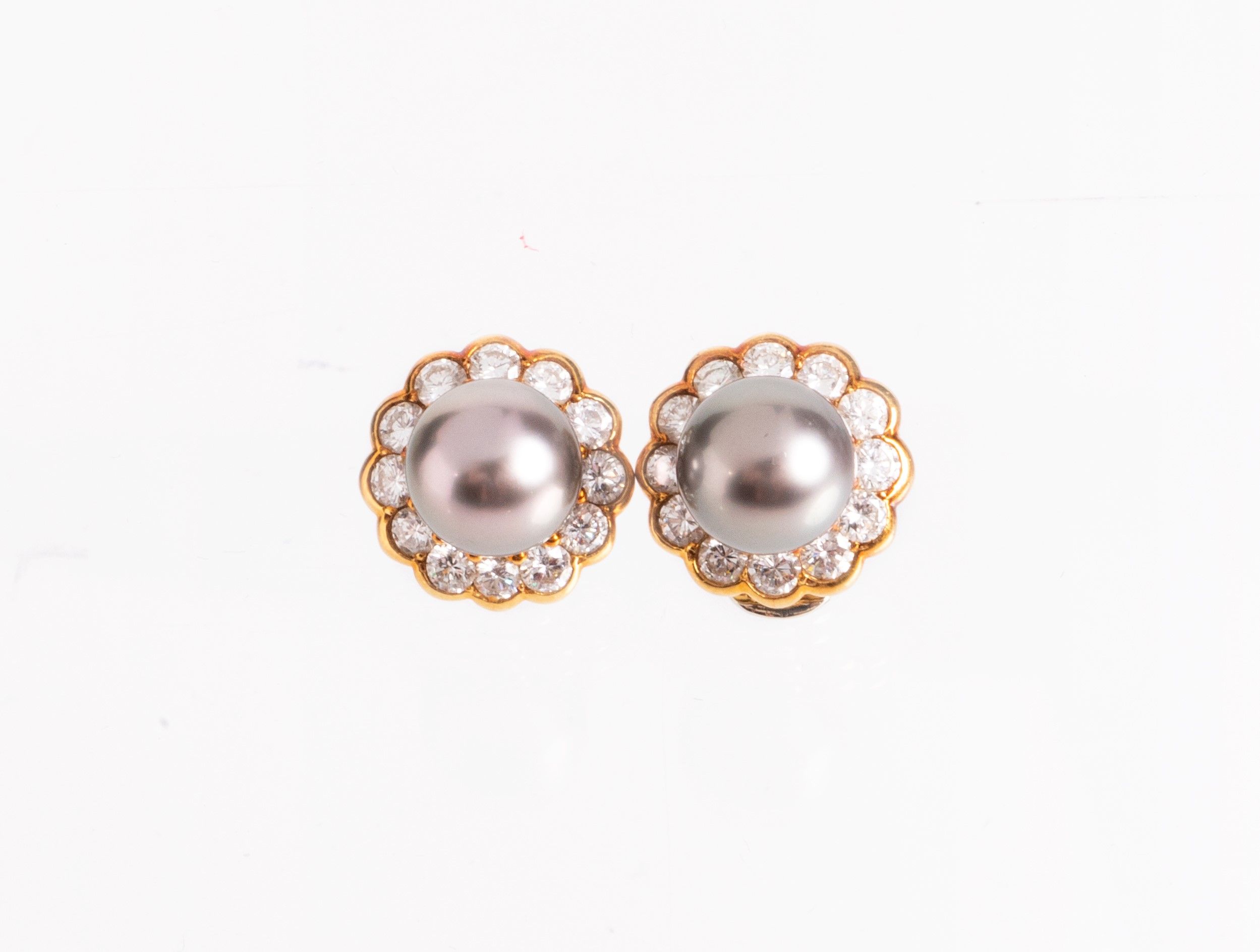 Oro 18 kt, orecchini cm 1,6 ø ognuno, perle mm 10 ø, diamanti taglio brillante ct 2,40, g 14,5.