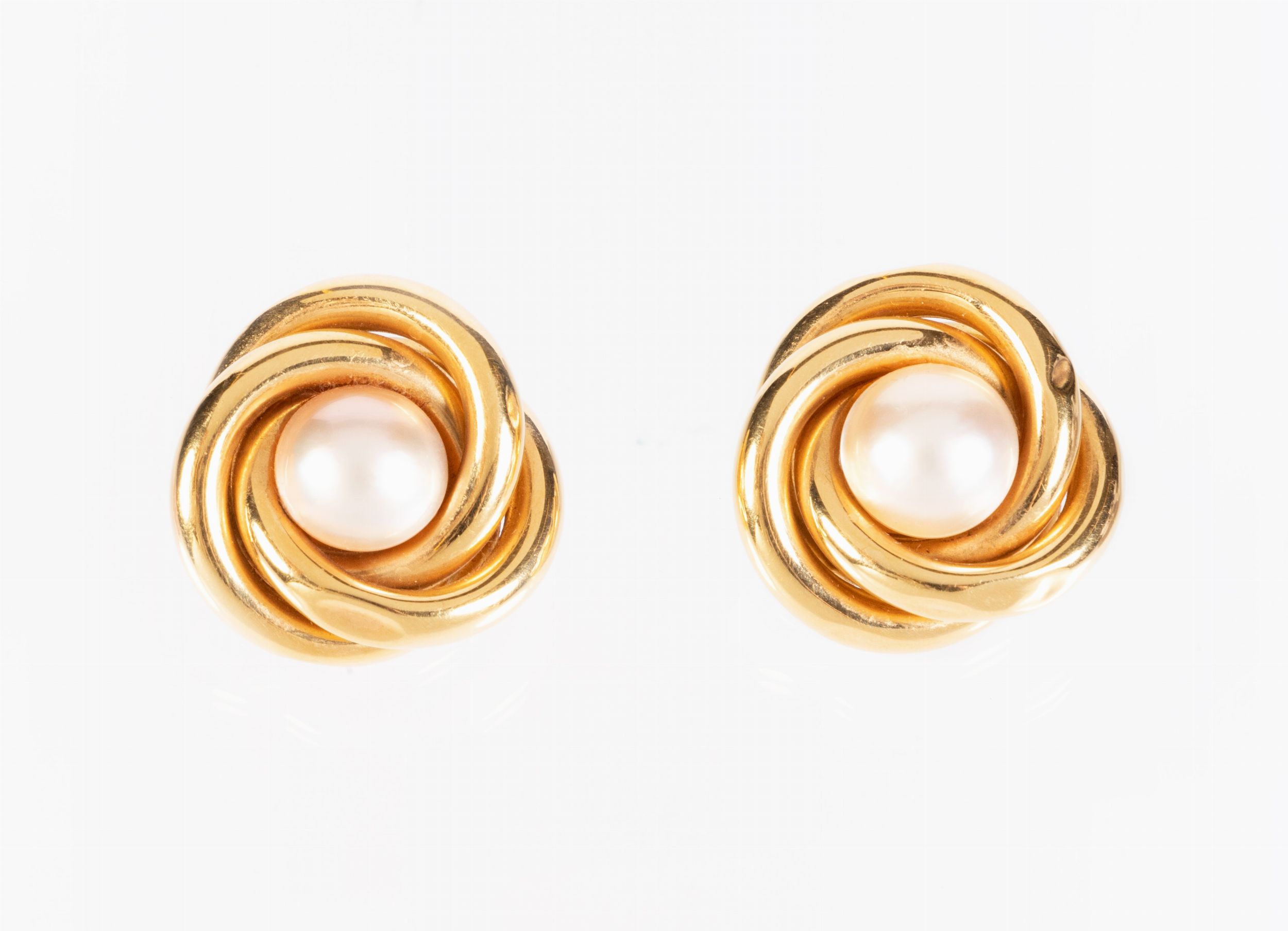 Oro 18 kt, cm 3,2 ř ognuno, perle mm 15 ř, g 26.