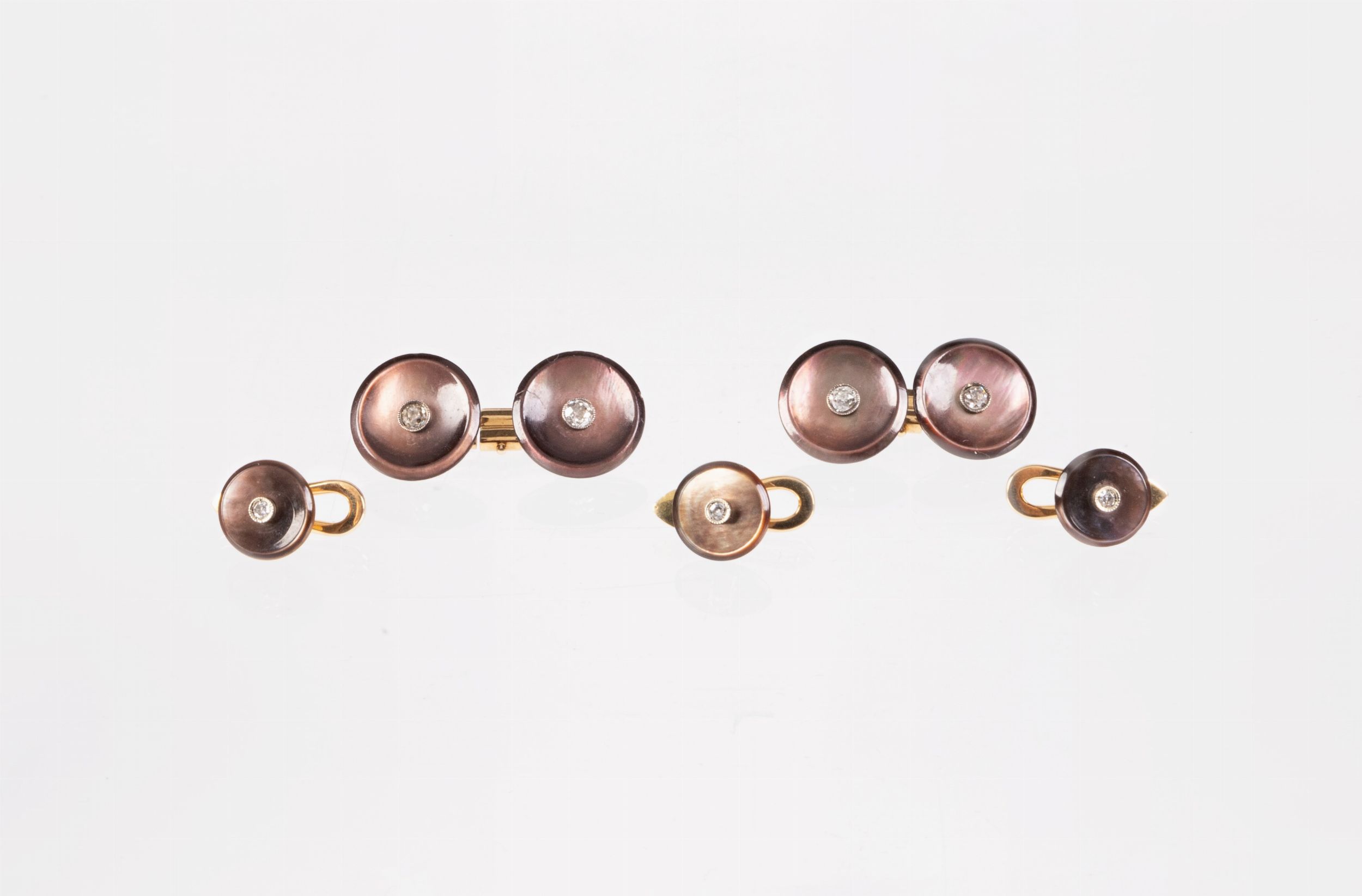 Set da sparato con gemelli e tre bottoni in oro giallo, madreperla e diamanti vecchio [..]