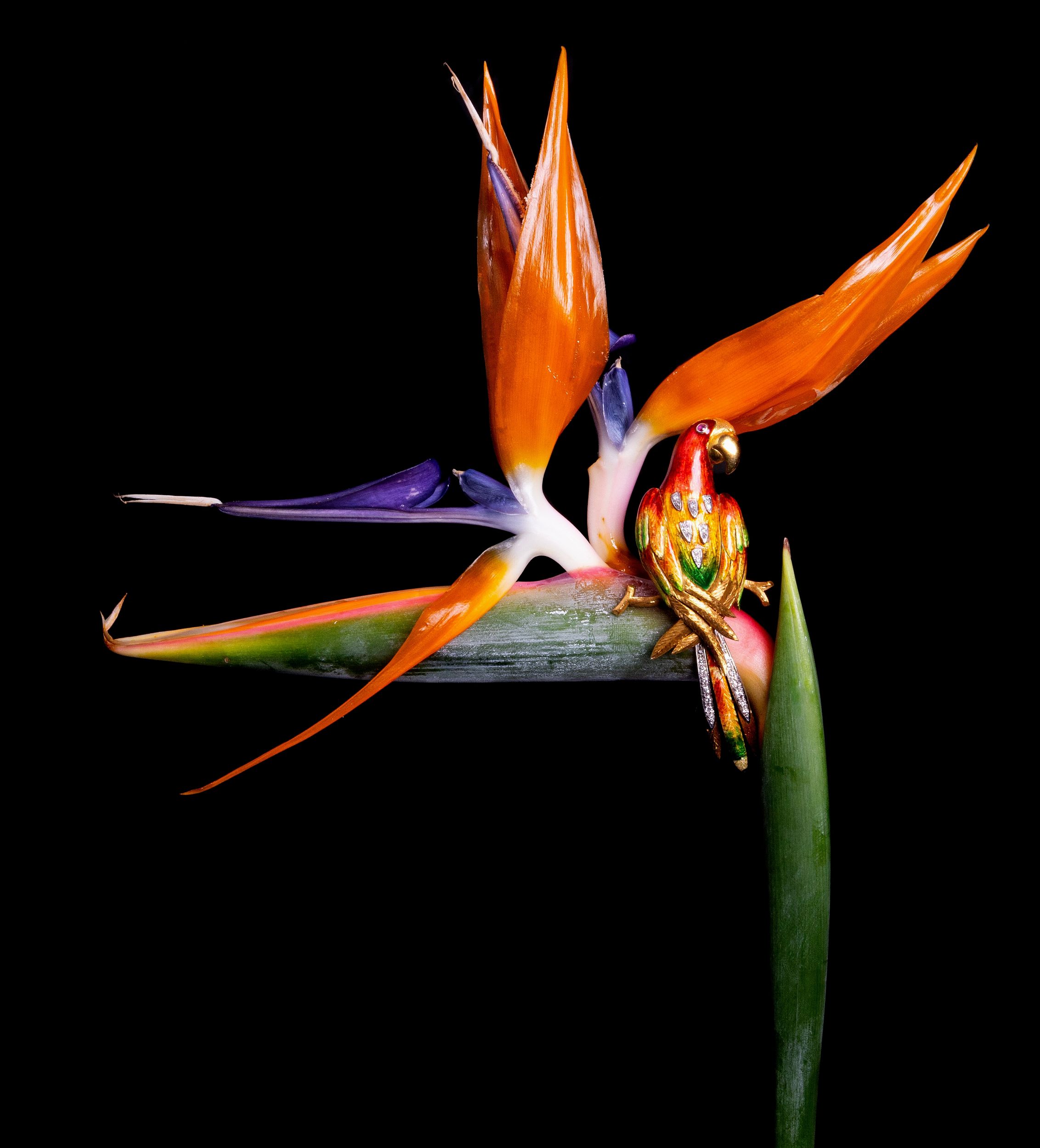 Spilla a pappagallo in oro giallo con smalti policromi e diamanti