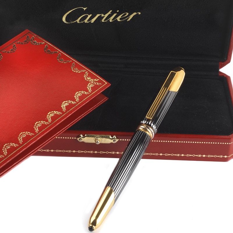 fusto scanalato in metallo antracite brillante, fondello liscio in metallo dorato con pietra cabochon nera, impugnatura in metallo scanalato, cappuccio scanalato in metallo grigio e dorato sormontato da pietra cabochon, alla base tre anelli intrecciati in tre colori d'oro, firmata Cartier, pennino in oro 18kt, misura M, caricamento a stantuffo, lungh. cm 13. Corredata di scatola e garanzia.