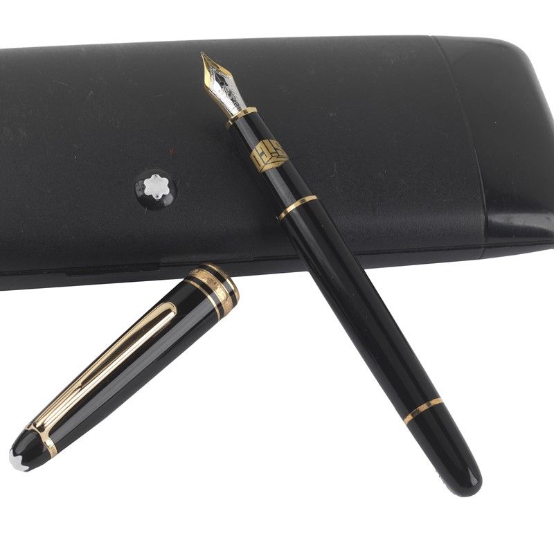 MONTBLANC MEISTERSTÜCK N. 144 PENNA STILOGRAFICA fusto in resina nera, dettagli finitura in metallo dorato, pennino in oro 14kt, firmata Montblanc e Sico, cappuccio sormontato dall'emblema a stella bianca, caricamento a stantuffo, lungh. cm 14. Corredata di scatola.