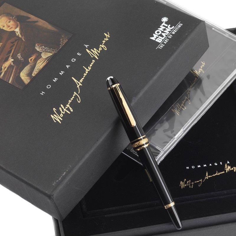 MONTBLANC MEISTERSTUCK HOMMAGE A W.A. MOZART PENNA STILOGRAFICA fusto in resina di colore nero, dettagli finitura in metallo argentato, cappuccio sormontato dall'emblema a stella bianca, pennino in oro 14kt misura M, caricamento a cartuccia, lungh. cm 11,5. Corredata di scatola, cd e libretto.