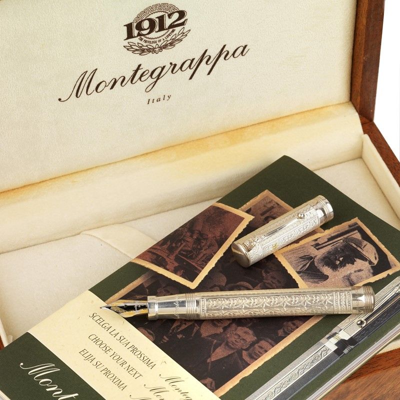 MONTEGRAPPA LANCASTER PENNA STILOGRAFICA IN ARGENTO fusto in argento sterling finemente decorato a motivi floreali e fogliacei, fermaglio con rosa incisa, punzoni 925 e del fabbricante, pennino in oro 18kt misura F, caricamento a cartuccia, lungh. cm 13 cm circa. Corredata di scatola e libretto.
