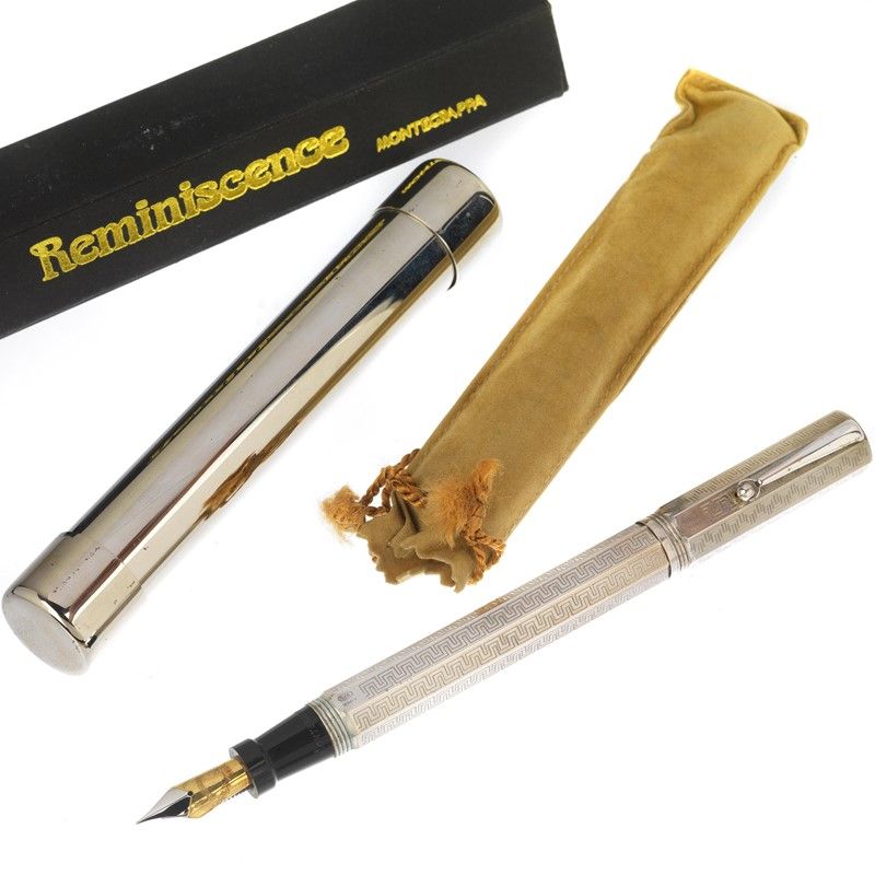 MONTEGRAPPA REMINISCENCE 99 PENNA STILOGRAFICA IN ARGENTO fusto in argento sterling finemente decorato a motivo greco, punzoni 925 e del fabbricante, pennino in oro 14kt, caricamento a cartuccia, lungh. cm 13 cm circa, gr. 35. Accompagnata da astuccio cilindrico in metallo e pergamena. Corredata di scatola.