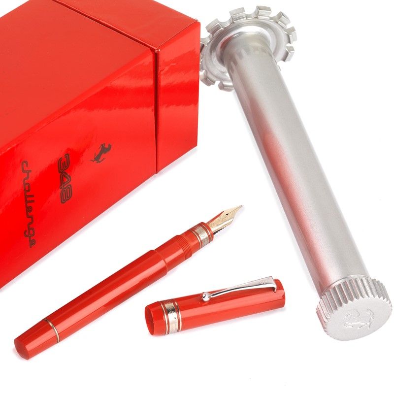 OMAS 348 CHALLENGE PENNA STILOGRAFICA fusto in brillante rosso Ferrari, dettagli di rifinitura in metallo argentato, fermaglio con logo Ferrari, pennino in oro 18kt misura M, caricamento a stantuffo, lungh. cm 14. Corredata di scatola a cilindro in metallo, controscatola e garanzia.
