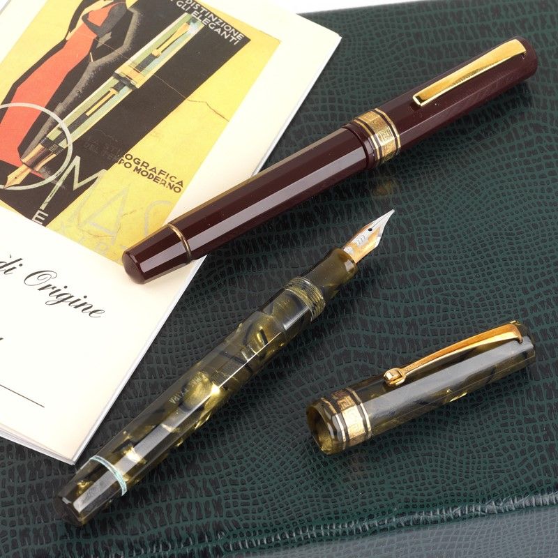 OMAS EXTRA DUE PENNE STILOGRAFICHE una penna Omas dal fusto verde effetto marmorizzato e una penna dal fusto in resina di colore bordeaux, dettagli di rifinitura in metallo dorato, decorazione a motivo greco, pennino in oro 18kt, caricamento a stantuffo. Corredate di una scatola.