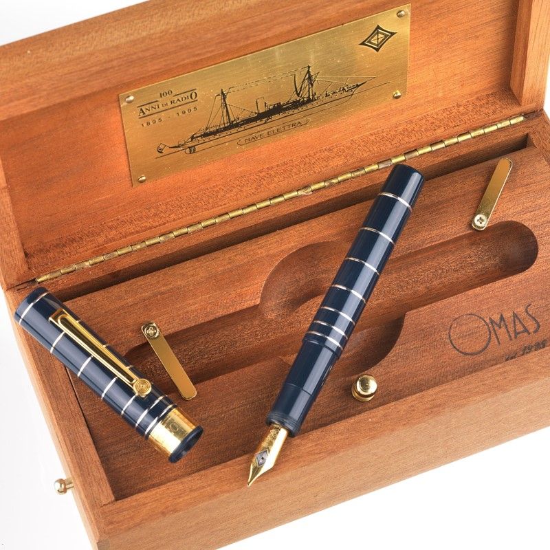 OMAS GUGLIELMO MARCONI EDIZIONE LIMITATA 100 ANNI DI RADIO (1895 - 1995) PENNA STILOGRAFICA serie limitata 4.000 esemplari, fusto in resina di colore blu petrolio decorata a cerchi concentrici a rievocare le onde, dettagli finiture in metallo dorato e argentato, pennino in oro 18kt misura M, caricamento a stantuffo, lungh. cm 14. Corredata di scatola in legno e garanzia.