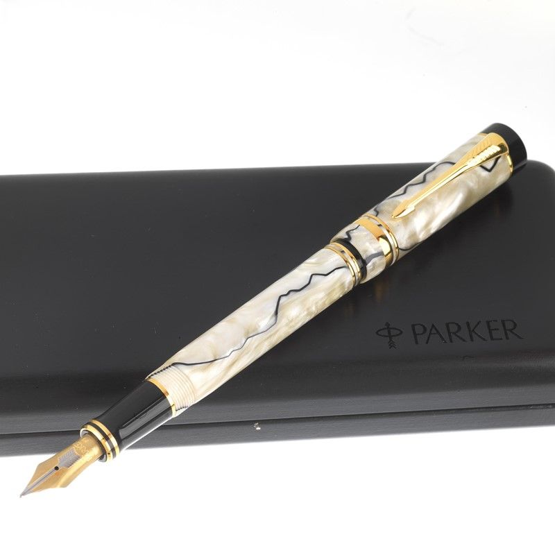 PARKER DUOFOLD CENTENNIAL MOP PENNA STILOGRAFICA fusto in resina color madreperla effetto marmorizzato, dettagli finitura in metallo dorato, pennino oro 18kt misura M, caricamento a cartuccia, lungh. cm 14. Corredata di scatola, controscatola e libretto.