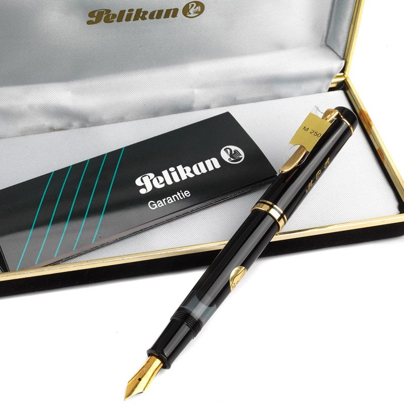 PELIKAN M250 PENNA STILOGRAFICA fusto in resina nera, dettagli finitura in metallo dorato, cappuccio in resina nera recante personalizzazione in lettere "M.P.A." e sormontato da emblema di Pelikan e fermaglio a forma di volatile, pennino oro 14kt misura F, caricamento a stantuffo, lungh. cm 14. Corredata di scatola e garanzia.