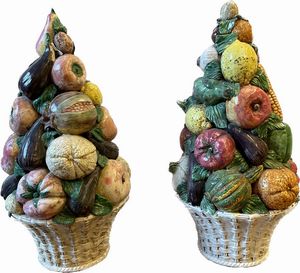 DONATORE ANONIMO Coppia di grandi centro tavola piramidali in maiolica modellate in forma di cestine dipinte in [..]